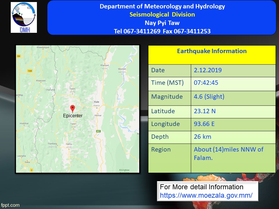 ယနေ့ နံနက် ၇ နာရီ ၄၂ မိနစ် ၄၅ စက္ကန့်တွင် ဟားခါးမြေငလျင်စခန်းမှ မြောက်-အရှေ့မြောက်ဘက် (၃၃)မိုင် ခန့်ကွာဝေးသော၊ မြန်မာနိုင်ငံပြည်တွင်း၊ (ဖလမ်းမြို့၏ မြောက်-အနောက်မြောက်ဘက် (၁၄)မိုင် ခန့်အကွာ)၊ မြောက်လတ္တီတွဒ် ၂၃ ဒသမ ၁၂ ဒီဂရီ၊ အရှေ့လောင်ဂျီတွဒ် ၉၃ ဒသမ ၆၆ ဒီဂရီ၊ အနက်(၂၆) ကီလိုမီတာကို ဗဟိုပြု၍ အင်အား ရစ်(ခ်)တာစကေး ၄ ဒသမ ၆ အဆင့်ရှိ အင်အားအနည်းငယ်ရှိသော မြေငလျင်တစ်ခု လှုပ်ရှားသွားကြောင်း မိုးလေဝသနှင့် ဇလဗေဒညွှန်ကြားမှု ဦးစီးဌာန၏ ထုတ်ပြန်ချက်အရ သိရသည်။