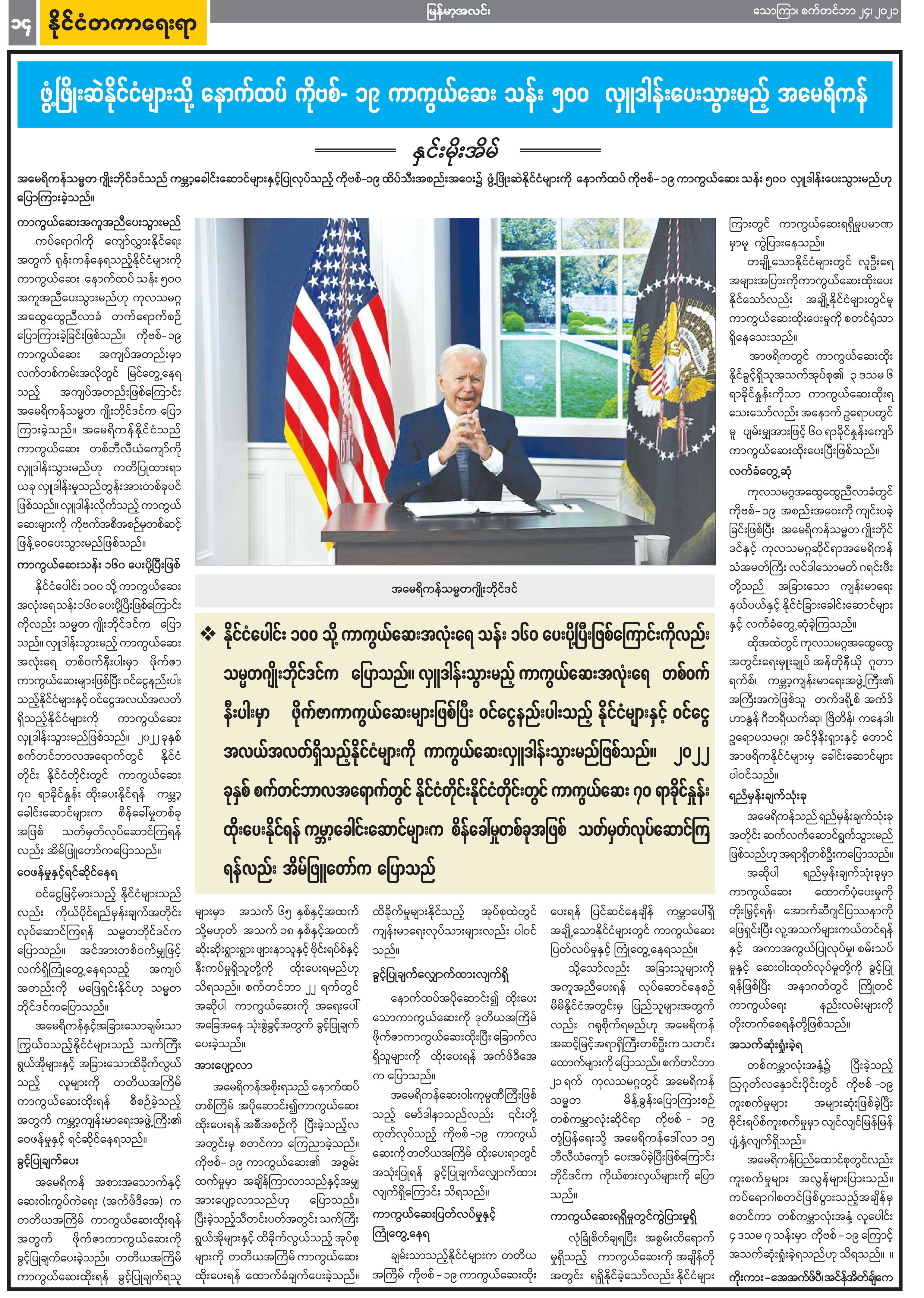 ဖွံ့ဖြိုးဆဲနိုင်ငံများသို့ နောက်ထပ် ကိုဗစ်-၁၉ ကာကွယ်ဆေး သန်း ၅၀၀ လှူဒါန်းပေးသွားမည့် အမေရိကန်