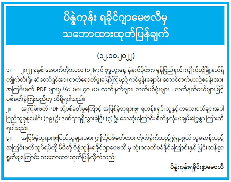 ၂။        အကြမ်းဖက် PDF တို့ပစ်ခတ်မှုကြောင့်  အပြစ်မဲ့ဘုရားဖူး  ရဟန်း၊ ရှင်၊ လူ၊ အမျိုးသမီးနှင့် ကလေးငယ်များအပါ ပြည်သူစုစုပေါင်း (၁၉) ဦး ဒဏ်ရာရရှိသွားခဲ့ပြီး (၃) ဦး သေဆုံးကြောင်း စိတ်နှလုံး မချမ်းမြေ့စွာ ကြားသိ ရပါသည်။