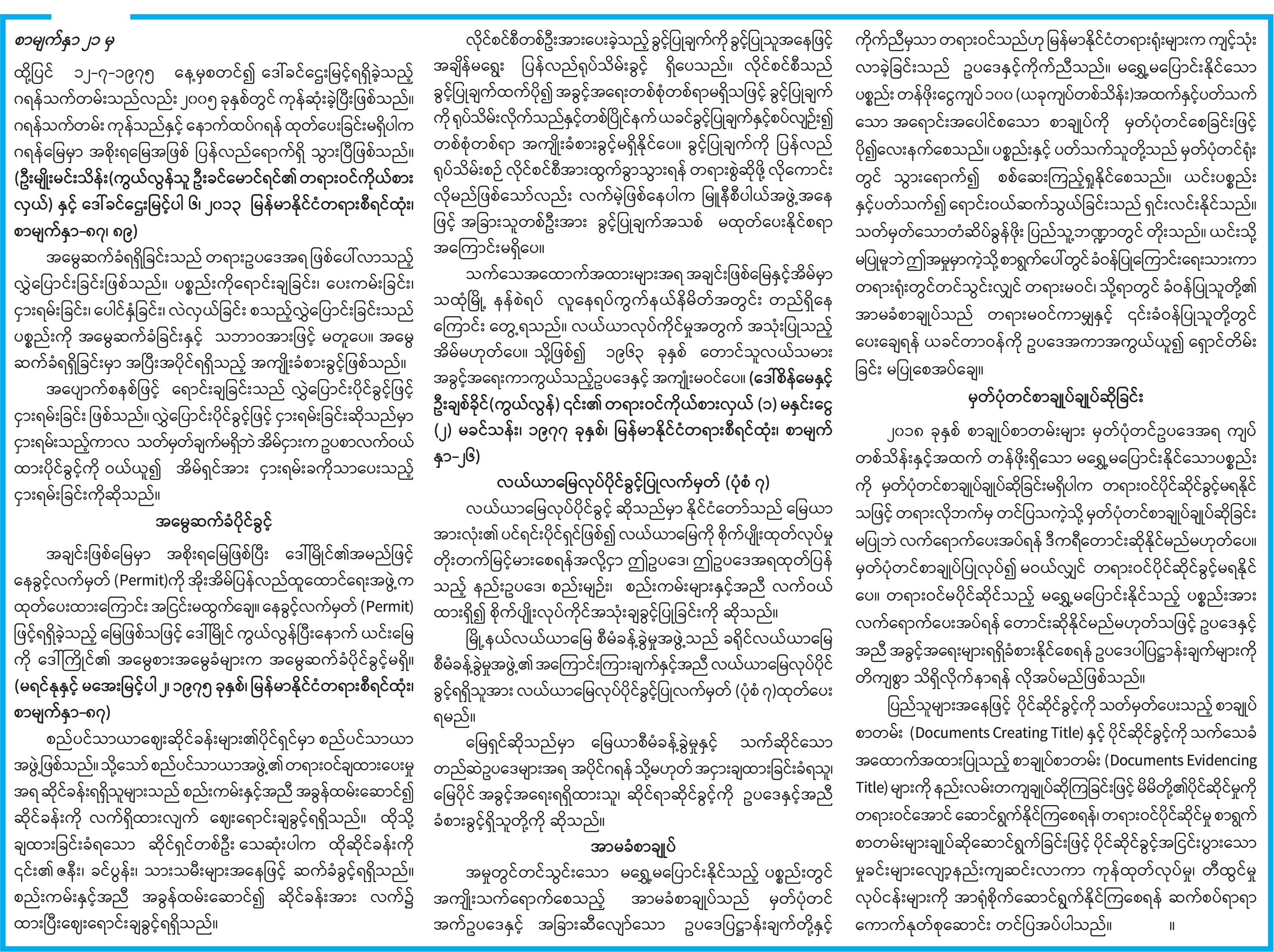 ပိုင်ဆိုင်ခွင့်ကို သတ်မှတ်ပေးသည့် စာချုပ်စာတမ်း (Documents Creating Title) နှင့် ပိုင်ဆိုင်ခွင့်ကို သက်သေခံအထောက်အထားပြုသည့် စာချုပ်စာတမ်း (Documents Evidencing Title)
