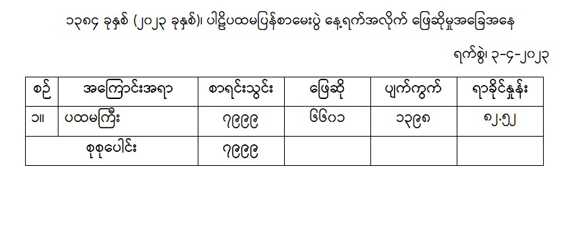 သာသနာရေးနှင့် ယဉ်ကျေးမှုဝန်ကြီးဌာန၊ သာသနာရေးဦးစီးဌာနက ကြီးမှူး၍ နှစ်စဉ်ကျင်းပသော ၂၀၂၃ ခုနှစ်၊ ပါဠိပထမပြန်စာမေးပွဲ ယနေ့ (သတ္တမနေ့) တွင် နိုင်ငံတစ်ဝန်းရှိ စာဖြေဌာန ၂၂၉ ဌာနတို့၌ စာဖြေစာရင်းသွင်း ၇၉၉၉ ပါး/ဦးအနက် ၆၆၀၁ ပါး/ဦး ဖြေဆိုကြသဖြင့် ၈၂ ဒသမ ၅၂ ရာခိုင်နှုန်း ဖြေဆိုကြကြောင်း သာသနာရေးဦးစီးဌာနမှ သိရသည်။