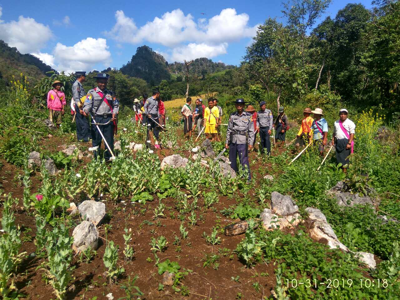ပင်လောင်းမြို့နယ်ရဲတပ်ဖွဲ့မှ ဒုရဲမှူး မျိုးလွင်ဦးစီးသည့် ပူးပေါင်းအဖွဲ့သည် အောက်တိုဘာ ၃၁ ရက်နေ့တွင် ပင်လောင်းမြို့နယ်၊ ဝါးပြုံးကျေးရွာ၏ တောင်ဘက် ၅ မိုင်ခန့်အကွာ၌ အမြင့် ၂ ပေခန့်ရှိ သီးပွင့်ဆဲ ဘိန်းခင်း စုစုပေါင်း ၂၄ ဧကခန့်အား ဖျက်ဆီး ဆောင်ရွက်ခဲ့ကြောင်း သတင်းရရှိသည်။