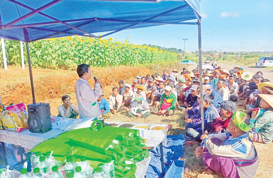 ရှမ်းပြည်နယ် (တောင်ပိုင်း) ပအိုဝ်းကိုယ်ပိုင်အုပ်ချုပ်ခွင့်ရဒေသ ပင်လောင်းမြို့နယ် စိုက်ပျိုးရေးဦးစီးဌာနမှ နေကြာသီးနှံမျိုးစေ့ထုတ် စံပြကွက် နည်းပညာပေး ကွင်းသရုပ်ပြပွဲကို ယနေ့နံနက်ပိုင်းက တကူမို့ကျေးရွာ ဦးခွန်လှဆောင် စံပြနေကြာစိုက်ခင်း၌ ပြုလုပ်သည်။