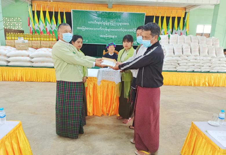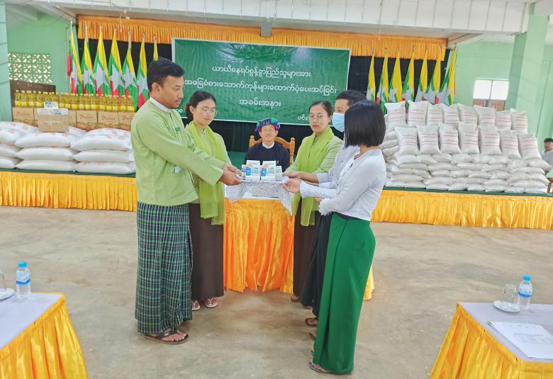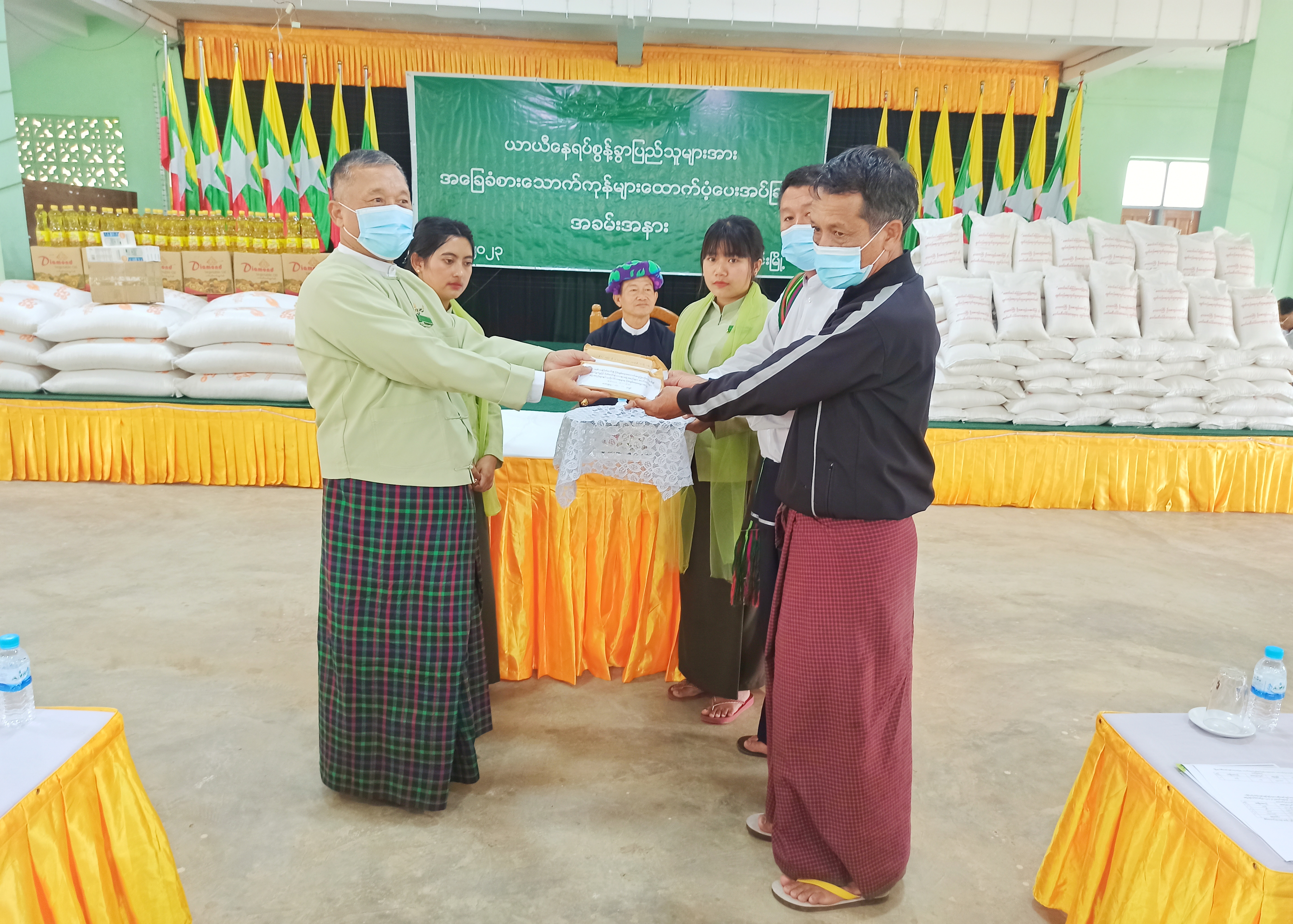 ဦးစွာ မြို့နယ်စီမံအုပ်ချုပ်ရေးအဖွဲ့ဥက္ကဋ္ဌ ဦးတင့်ဇော်ထက်က ယာယီနေရပ်စွန့်ခွာ ပြည်သူများအား အခြေခံ စားသောက်ကုန်များ  ထောက်ပံ့ပေးအပ်ရခြင်းနှင့် ထောက်ပံ့ပေးနေမှု အခြေအနေများကို ရှင်းလင်းတင်ပြသည်။ ထို့နောက် ပအိုဝ်းကိုယ်ပိုင်အုပ်ချုပ်ခွင့်ရဒေသ စီမံအုပ်ချုပ်ရေးအဖွဲ့ အတွင်းရေးမှူး ဦးတင်ထူးမောင်၊ နယ်စပ်ဒေသနှင့် တိုင်းရင်းသားလူမျိုးများ ဖွံ့ဖြိုးတိုးတက်ရေးဦးစီးဌာန ဒုတိယညွှန်ကြားရေးမှူး ဦးဆွေလင်းမြင့်၊ မြို့နယ်စီမံအုပ်ချုပ်ရေးအဖွဲ့ ဥက္ကဋ္ဌ ဦးတင့်ဇော်ထက်၊ ပအိုဝ်းကိုယ်ပိုင်အုပ်ချုပ်ခွင့်ရဒေသ မိခင်နှင့်ကလေးစောင့်ရှောက်ရေးအသင်းဥက္ကဋ္ဌ ဒေါ်ခင်ညီလာကျော်တို့က ယာယီနေရပ်စွန့်ခွာ ပြည်သူများအား အခြေခံစားသောက်ကုန်များနှင့် အလှူငွေများ၊ Grade 11 နှင့် Grade 12 တွင် ပညာသင်ကြားနေသည့် ယာယီနေရပ်စွန့်ခွာ ပြည်သူများ၏ သားသမီးများအား Scientific Calculator (ဂဏန်းပေါင်း)များ ထောက်ပံ့ပေးအပ်ကြသည်။