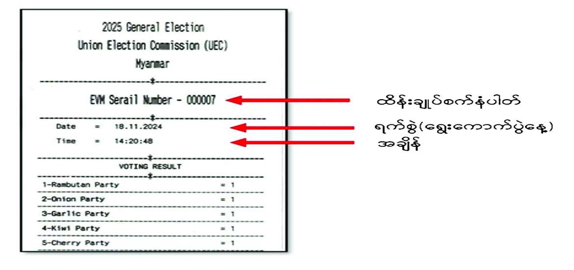 ထို့အပြင် မဲရလဒ်ဖြတ်ပိုင်းတွင် ထိန်းချုပ်စက် နံပါတ်၊ ရွေးကောက်ပွဲကျင်းပသည့် ရက်စွဲ၊ ဖြတ်ပိုင်းထုတ်ယူသည့် အချိန်တို့ ဖော်ပြပါရှိသဖြင့် မဲရုံကိုယ်စားလှယ်များက တိတိကျကျ စစ်ဆေးကြည့်ရှုနိုင်မည်ဖြစ်ပါသည်။