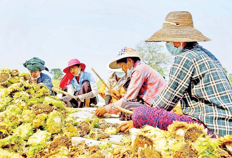“မိုးရာသီတွင် စိုက်ပျိုးသည့် နေကြာ ၁၀၄၆ ဧကအထိ လျာထားစိုက်ပျိုးနိုင်ခဲ့ပါတယ်။ အခုအချိန်မှာ စိုက်ပျိုးထားတဲ့ နေကြာစိုက်ခင်းတွေအားလုံး ရိတ်သိမ်းခြွေလှေ့ပြီးစီးပြီ ဖြစ်ပါတယ်။ နေကြာသီးနှံက အောင်မြင်ဖြစ်ထွန်းမှုရှိတာကြောင့် ပြီးခဲ့တဲ့နှစ်ထက် သီးနှံအထွက်နှုန်း ကောင်းပါတယ်။ တစ်ဧကကို ၁၉ ဒသမ ၃၄ တင်း ထွက်ရှိပါတယ်။ နေကြာသီးနှံ ရိတ်သိမ်းခြွေလှေ့ခြင်းနဲ့ ပတ်သက်ပြီး သီးနှံအထွက်နှုန်းတွေ လျော့နည်းမှုမဖြစ်အောင် တောင်သူတွေကို အချိန်မီ ရိတ်သိမ်းခြွေလှေ့ကြဖို့၊ သီးနှံအရည်အသွေးကောင်းမွန်အောင် အမိုးအကာအောက် စနစ်တကျ သိမ်းဆည်းကြဖို့ တောင်သူပညာပေးလုပ်ငန်းတွေကို ကွင်းဆင်းကြီးကြပ်ဆောင်ရွက်ပေးခဲ့ပါတယ်”ဟု ပွင့်ဖြူမြို့နယ် စိုက်ပျိုးရေးဦးစီးဌာန ဦးစီးမှူး ဒေါ်မိုးမိုးဝေက ပြောသည်။