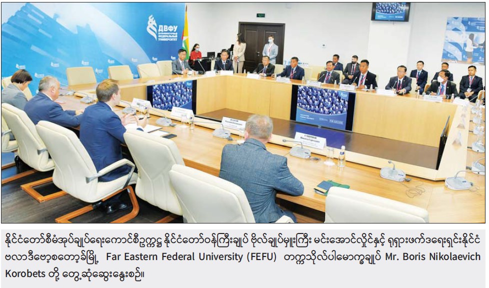 ပြည်ထောင်စုသမ္မတမြန်မာနိုင်ငံတော် နိုင်ငံတော်စီမံအုပ်ချုပ်ရေးကောင်စီဥက္ကဋ္ဌ နိုင်ငံတော်ဝန်ကြီးချုပ် ဗိုလ်ချုပ်မှူးကြီး မင်းအောင်လှိုင် ဦးဆောင်သည့် အဆင့်မြင့် ကိုယ်စားလှယ်အဖွဲ့၏ ခရီးစဉ်တတိယမြောက်နေ့ မွန်းလွဲပိုင်းဖြစ်သည်။ ရုရှားဖက်ဒရေးရှင်းနိုင်ငံ ဗလာဒီဗော့စတော့ခ်မြို့ Far Eastern Federal University (FEFU) တက္ကသိုလ်၏ ဧည့်ခန်းမဆောင်အတွင်း နိုင်ငံတော်အကြီးအကဲ ဗိုလ်ချုပ်မှူးကြီး မင်းအောင်လှိုင် ဦးစီးသည့် အဆင့်မြင့် ကိုယ်စားလှယ်အဖွဲ့နှင့် တက္ကသိုလ်၏ပါမောက္ခချုပ် Mr.Boris Nikolaevich Korobets ဦးဆောင်သည့်အဖွဲ့တို့ တွေ့ဆုံဆွေးနွေးမှုကို ဆောင်ရွက်နေကြသည်။