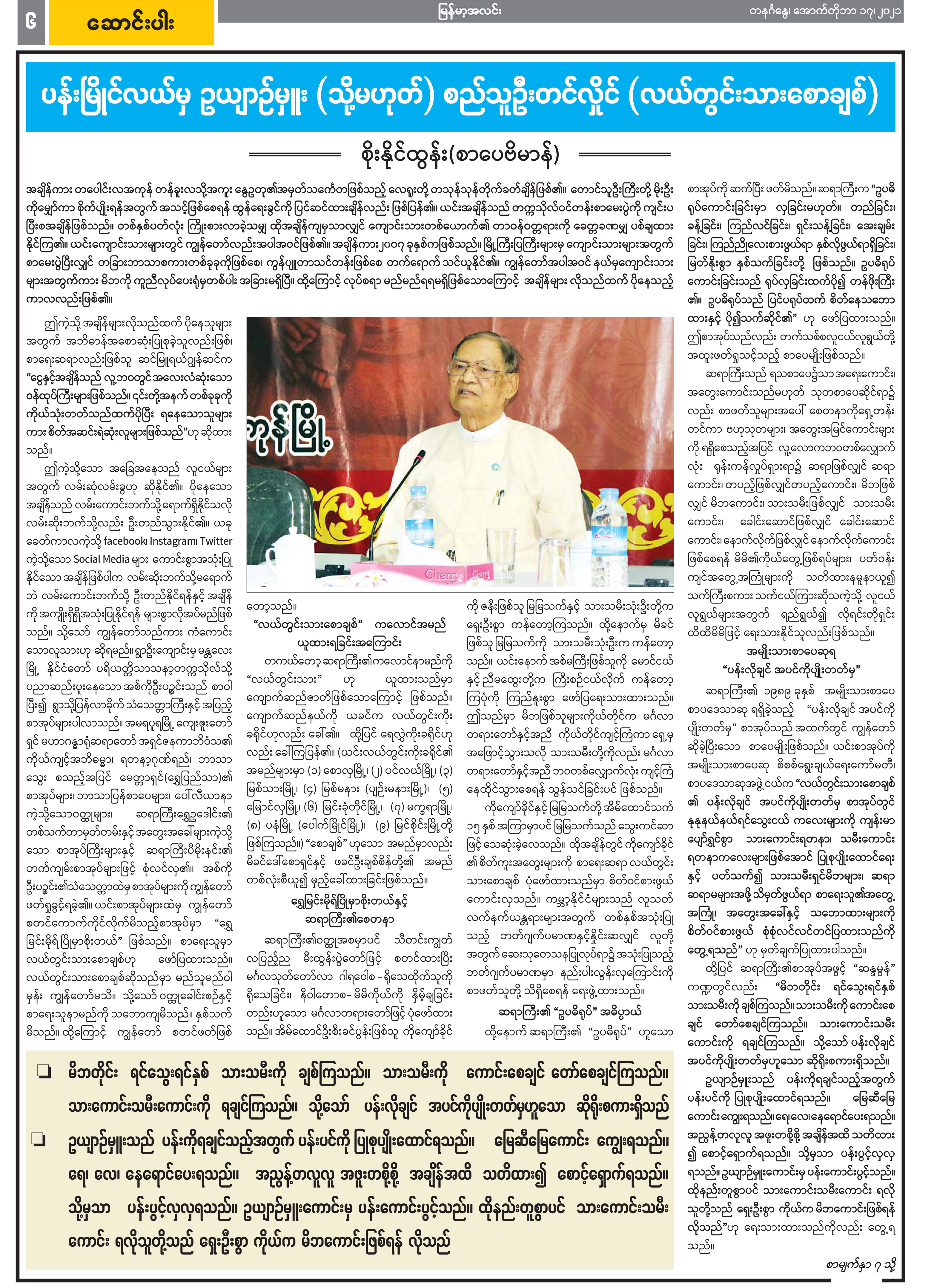 နိုင်ငံတည်ငြိမ်အေးချမ်းပြီး တရားဥပဒေစိုးမိုးမှုရှိစေရေး မိမိတို့အနေဖြင့် ဒီမိုကရေစီနည်းလမ်းဖြင့် ဆောင်ရွက်လျက်ရှိ တည်ငြိမ်အေးချမ်းပြီး တရားဥပဒေစိုးမိုးမှုရှိမှသာ ပြည်သူများ အလုပ်အကိုင်များ အဆင်ပြေချောမွေ့ပြီး နိုင်ငံဖွံ့ဖြိုးတိုးတက်လာမည်