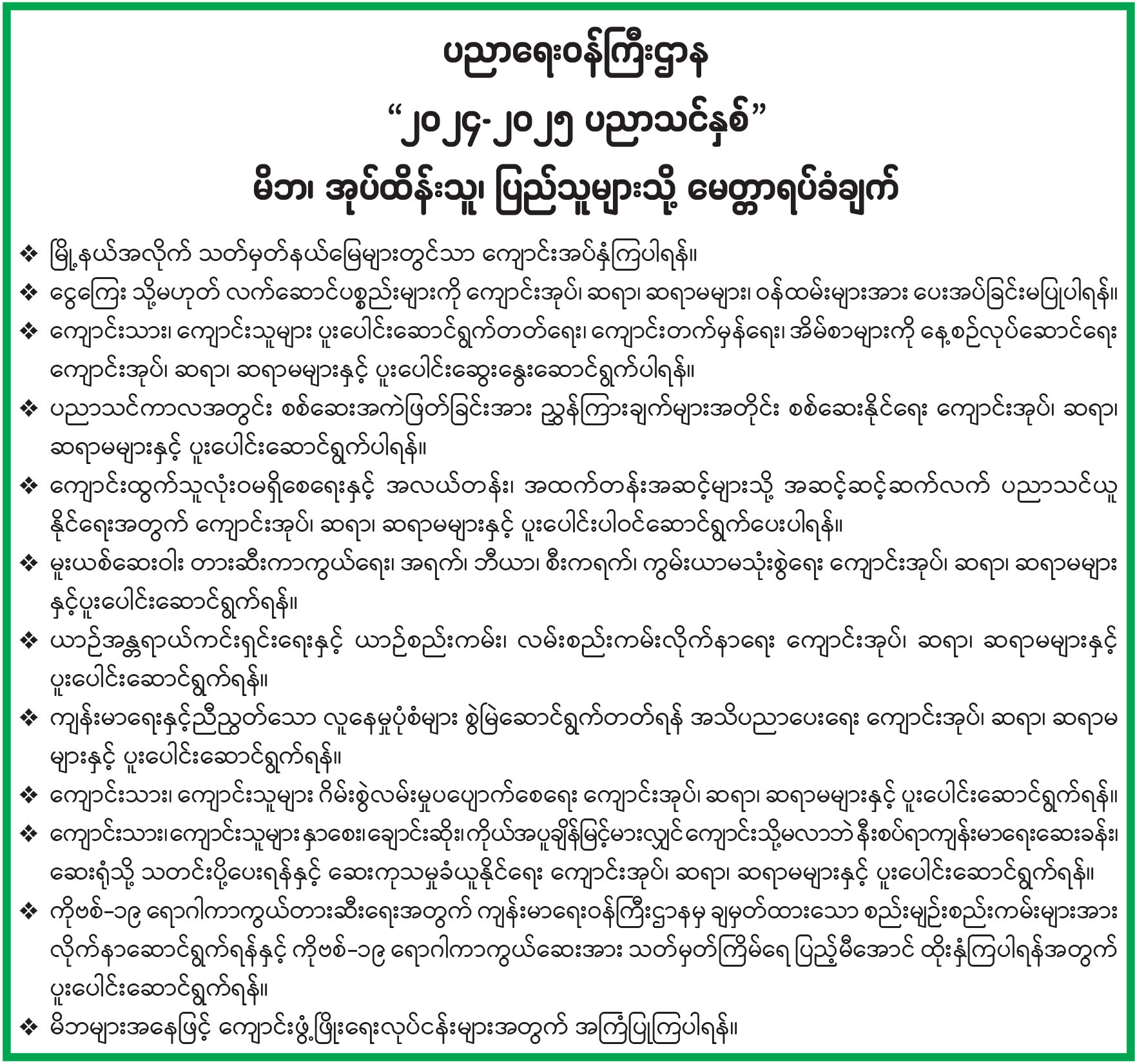 ပညာရေးဝန်ကြီးဌာန “၂၀၂၄-၂၀၂၅ ပညာသင်နှစ်” မိဘ၊ အုပ်ထိန်းသူ၊ ပြည်သူများသို့ မေတ္တာရပ်ခံချက်
