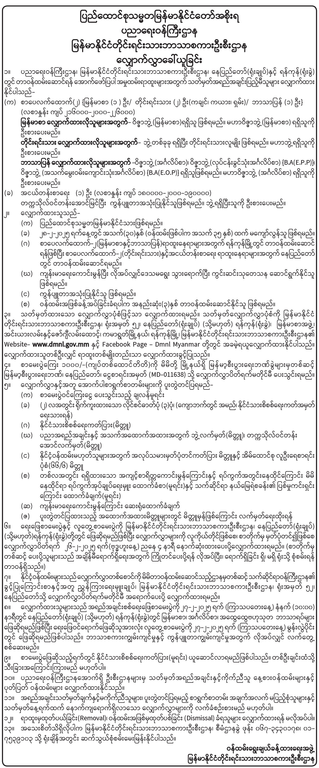 ပညာရေးဝန်ကြီးဌာန၊ မြန်မာနိုင်ငံတိုင်းရင်းသားဘာသာစကားဦးစီးဌာန၊ နေပြည်တော် (ရုံးချုပ်) နှင့် ရန်ကုန် (ရုံးခွဲ) တွင် တာဝန်ထမ်းဆောင်ရန် ဖော်ပြပါအမှုထမ်းရာထူးများအတွက် သတ်မှတ်အရည်အချင်း ပြည့်မီသူများ လျှောက်ထား