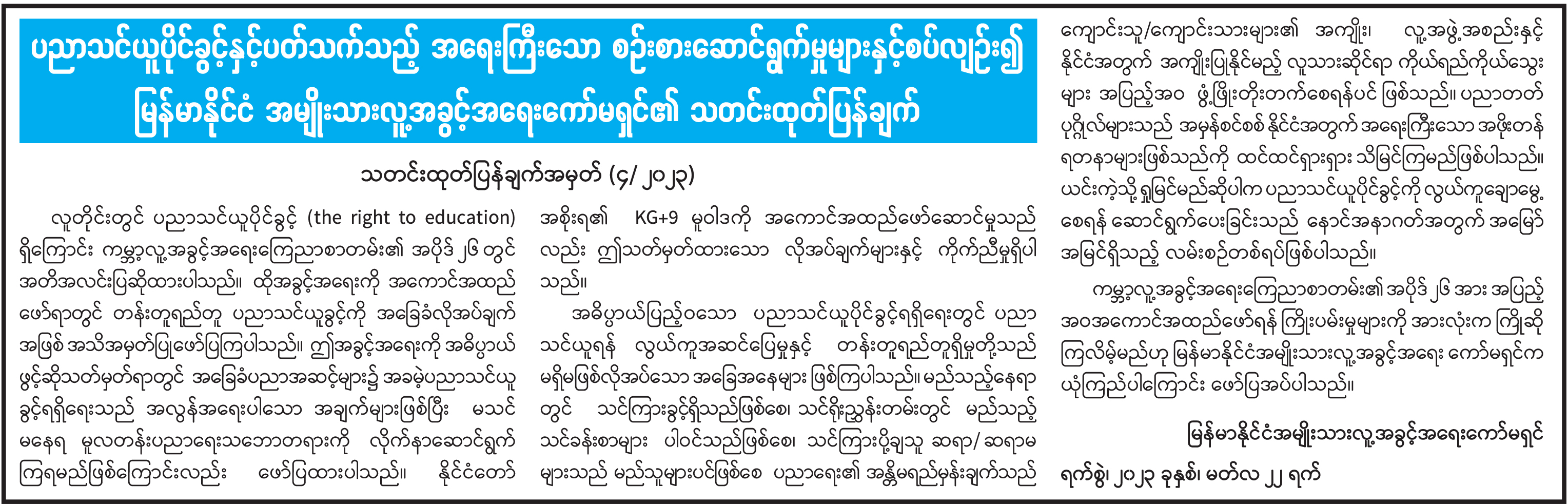 ပညာသင်ယူပိုင်ခွင့်နှင့်ပတ်သက်သည့် အရေးကြီးသော စဉ်းစားဆောင်ရွက်မှုများနှင့်စပ်လျဉ်း၍ မြန်မာနိုင်ငံ အမျိုးသားလူ့အခွင့်အရေးကော်မရှင်၏ သတင်းထုတ်ပြန်ချက်