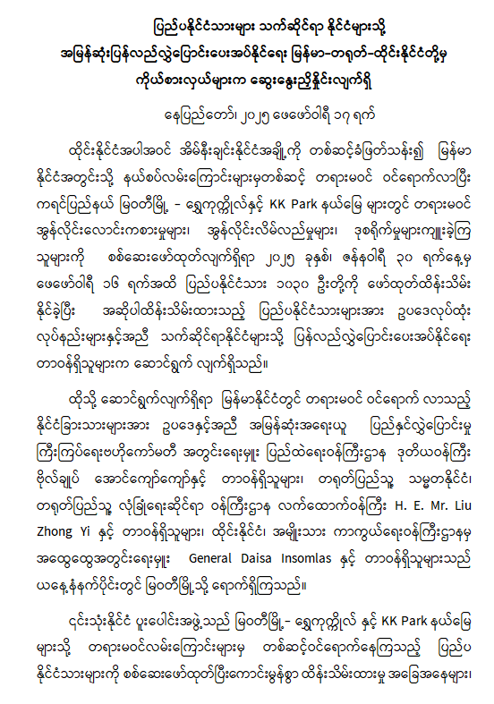 ပြည်ပနိုင်ငံသားများ သက်ဆိုင်ရာ နိုင်ငံများသို့ အမြန်ဆုံးပြန်လည်လွှဲပြောင်းပေးအပ်နိုင်ရေး မြန်မာ-တရုတ်-ထိုင်းနိုင်ငံတို့မှ ကိုယ်စားလှယ်များက ဆွေးနွေးညှိနှိုင်းလျက်ရှိ