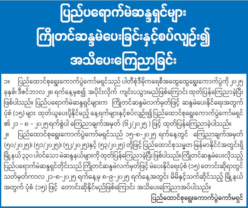 ပြည်ပရောက်မဲဆန္ဒရှင်များ ကြိုတင်ဆန္ဒမဲပေးခြင်းနှင့် စပ်လျဉ်း၍ အသိပေးကြေညာခြင်း