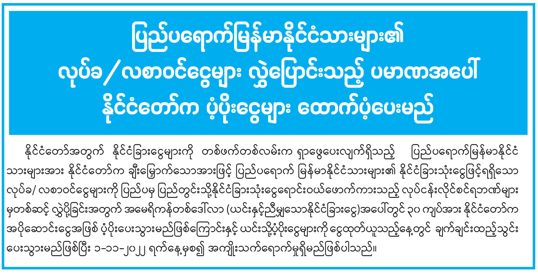 ပြည်ပရောက်မြန်မာနိုင်ငံသားများ၏ လုပ်ခ/လစာဝင်ငွေများ လွှဲပြောင်းသည့် ပမာဏအပေါ် နိုင်ငံတော်က ပံ့ပိုးငွေများ ထောက်ပံ့ပေးမည်