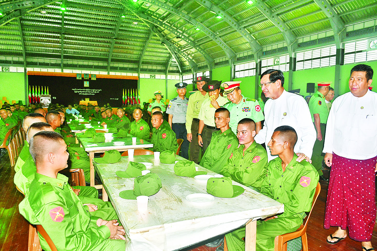 ယနေ့တွင်ဖွင့်လှစ်လိုက်သည့် ပြည်သူ့စစ်မှုထမ်းသင်တန်းအမှတ်စဉ်(၁၆)မှ နိုင်ငံ့သားကောင်းလူငယ် များအဖြစ် နိုင်ငံတော်ကာကွယ်ရေးနှင့် လုံခြုံရေးတာဝန်များကို ဂုဏ်ယူစွာထမ်းဆောင်ရန် သင်တန်းတက်ရောက်ကြမည့် သင်တန်းသားများ၏ စကားသံ များကိုလည်း ယခုလိုပဲကြား သိရပါသည်-