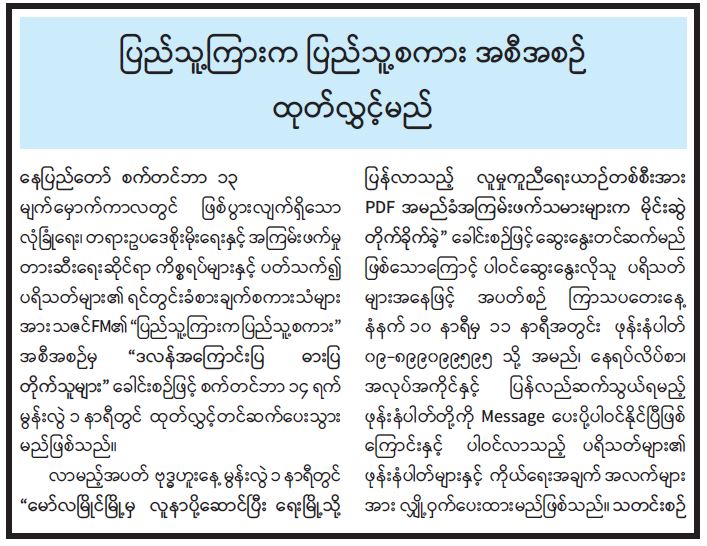 လာမည့်အပတ် ဗုဒ္ဓဟူးနေ့ မွန်းလွဲ ၁ နာရီတွင် “မော်လမြိုင်မြို့မှ လူနာပို့ဆောင်ပြီး ရေးမြို့သို့ ပြန်လာသည့် လူမှုကူညီရေးယာဉ်တစ်စီးအား PDF အမည်ခံအကြမ်းဖက်သမားများက မိုင်းဆွဲ တိုက်ခိုက်ခဲ့” ခေါင်းစဉ်ဖြင့် ဆွေးနွေးတင်ဆက်မည် ဖြစ်သောကြောင့် ပါဝင်ဆွေးနွေးလိုသူ ပရိသတ် များအနေဖြင့် အပတ်စဉ် ကြာသပတေးနေ့ နံနက် ၁၀ နာရီမှ ၁၁ နာရီအတွင်း ဖုန်းနံပါတ် ၀၉-၈၉၉၀၉၉၅၉၅ သို့ အမည်၊ နေရပ်လိပ်စာ၊ အလုပ်အကိုင်နှင့် ပြန်လည်ဆက်သွယ်ရမည့် ဖုန်းနံပါတ်တို့ကို Message ပေးပို့ပါဝင်နိုင်ပြီဖြစ် ကြောင်းနှင့် ပါဝင်လာသည့် ပရိသတ်များ၏ ဖုန်းနံပါတ်များနှင့် ကိုယ်ရေးအချက် အလက်များ အား လျှို့ဝှက်ပေးထားမည်ဖြစ်သည်။