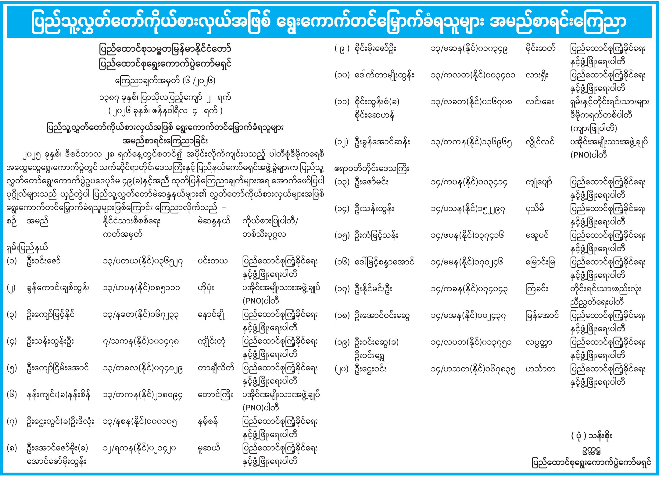 ပြည်သူ့လွှတ်တော်ကိုယ်စားလှယ်အဖြစ် ရွေးကောက်တင်မြှောက်ခံရသူများ အမည်စာရင်းကြေညာ