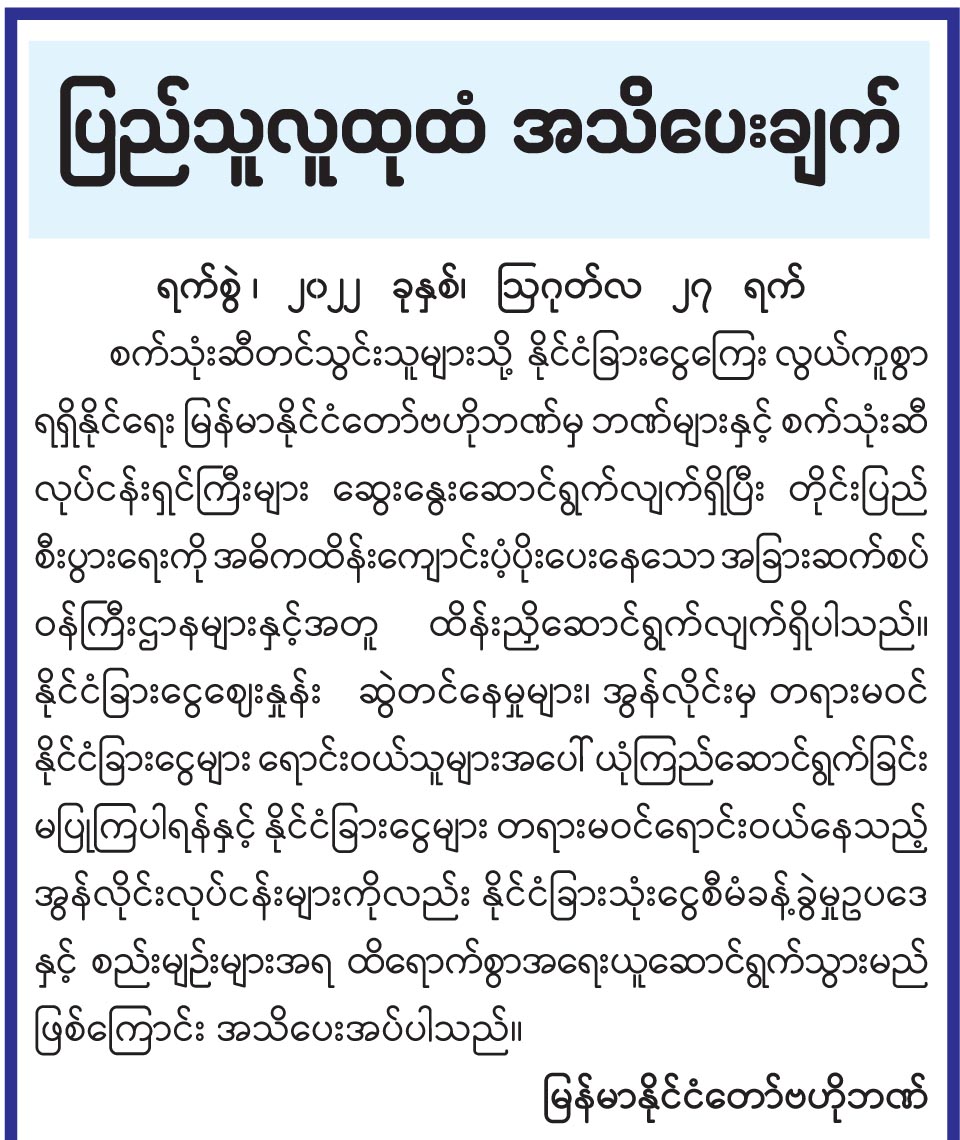 ပြည်သူလူထုထံ အသိပေးချက်