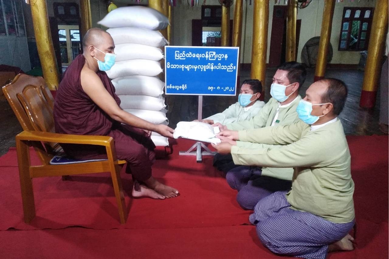 ထိုသို့ဆောင်ရွက်လျက်ရှိရာ ယနေ့တွင် နေပြည်တော်ကောင်စီနယ်မြေ၊ လယ်ဝေးမြို့နယ်ရှိ ပေါက်မြိုင် ကျောင်းတိုက်သို့လည်းကောင်း၊ ကရင်ပြည်နယ်၊ မြဝတီမြို့နယ်ရှိ အေးစေတီတောင်ပေါ်ကျောင်းသို့ လည်းကောင်း၊ စစ်ကိုင်းတိုင်းဒေသကြီး၊ ကန့်ဘလူမြို့နယ်ရှိ ရွှေသိမ်တော်ကျောင်းတိုက်သို့ လည်းကောင်း၊ ပဲခူးတိုင်းဒေသကြီး၊ ပန်းတောင်းမြို့နယ်ရှိ ငါးမျက်နှာ စေတီတော်မြတ်ကြီးကျောင်းတိုက်သို့ လည်းကောင်း၊ မန္တလေးတိုင်းဒေသကြီး၊ မိတ္ထီလာမြို့နယ်ရှိ သာသနာ့ဝေပုလ္လကျောင်းတိုက်သို့ လည်းကောင်း၊ ရခိုင်ပြည်နယ်၊ ပေါက်တောမြို့နယ်ရှိ ဘဝမ်းပရိယတ္တိ စာသင်တိုက်သို့လည်းကောင်း ဆရာတော်၊ သံဃာတော်များအတွက် ဆွမ်းဆန်တော်များကို ပြည်ထဲရေးဝန်ကြီးဌာန၊ တပ်ဖွဲ့/ဦးစီးဌာနများမှ သက်ဆိုင်ရာ နေပြည်တော်ကောင်စီနယ်မြေနှင့် တိုင်းဒေသကြီး/ပြည်နယ်တို့ရှိ တာဝန်ရှိသူများက သွားရောက် ဆက်ကပ်လှူဒါန်းခဲ့ကြကြောင်း သိရသည်။