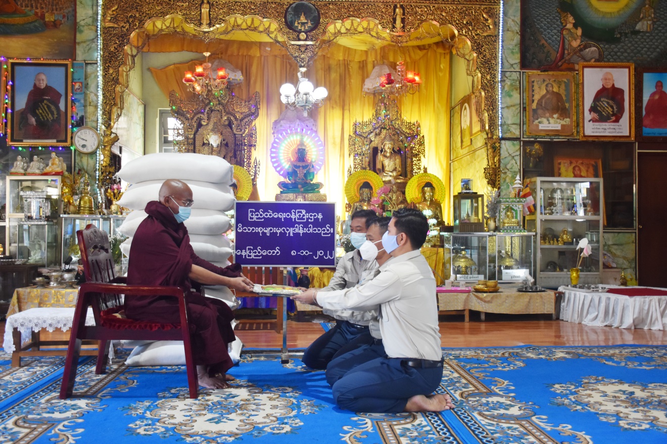 ထိုသို့ဆောင်ရွက်လျက်ရှိရာ ယနေ့တွင် နေပြည်တော်ကောင်စီနယ်မြေ၊ ပျဉ်းမနား မြို့နယ်ရှိ ဈေးကုန်းကျောင်းတိုက်၊ မွန်ပြည်နယ်၊ မော်လမြိုင်မြို့နယ်ရှိ ဝါးခယ်မကျောင်းတိုက်၊ ရန်ကုန်တိုင်းဒေသကြီး၊ ဒဂုံမြို့သစ်(မြောက်ပိုင်း)မြို့နယ်ရှိ အောင်ဓမ္မရိပ်သာကျောင်းတိုက်၊ မင်္ဂလာဒုံမြို့နယ်ရှိ သဲအင်းဂူဝိပဿနာဓမ္မရိပ်သာကျောင်းတိုက်၊ မင်္ဂလာတောင်ညွန့်မြို့နယ်ရှိ ရေတွင်းကုန်းကျောင်းတိုက်၊ မြောက်ဥက္ကလာပမြို့နယ်ရှိ ပညာလင်္ကာရမဏ္ဍိုင်ကျောင်းတိုက် နှင့် ရှမ်းပြည်နယ်၊ ကျိုင်းတုံမြို့နယ်ရှိ သာသနာ့ဝေပုလ္လပရိယတ္တိစာသင်တိုက်တို့သို့ ဆွမ်းဆန် တော်များကိုလည်းကောင်း၊ စစ်ကိုင်းတိုင်းဒေသကြီး၊ မုံရွာမြို့နယ်ရှိ မဟာသုဗောဓါရုံ ကျောင်းတိုက်၊ ပဲခူးတိုင်းဒေသကြီး၊ ပဲခူးမြို့နယ်ရှိ သာမဏေကျော် ကျောင်းတိုက်၊ မန္တလေးတိုင်းဒေသကြီး၊ အမရပူရမြို့နယ်ရှိ မဟာဝရဇိန်ကျောင်းတိုက်၊ ရန်ကုန်တိုင်းဒေသကြီး၊ တောင်ဥက္ကလာပမြို့နယ်ရှိ၊ အောင်ပင်လယ်ပရိယတ္တိစာသင်တိုက်၊ ရှမ်းပြည်နယ်၊ တောင်ကြီး မြို့နယ်ရှိ မူလမင်းကွန်းကျောင်းတိုက်နှင့် လားရှိုးမြို့နယ်ရှိ ဓမ္မဂုဏ်ရည်ကျောင်းတိုက်တို့သို့ ဆန်ကြာဆံများကို လည်းကောင်း ဆရာတော်၊ သံဃာတော်များအတွက် တာဝန်ရှိသူများက သွားရောက်ဆက်ကပ်လှူဒါန်းခဲ့ကြကြောင်း သိရသည်။