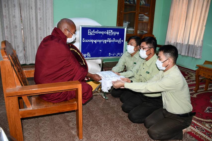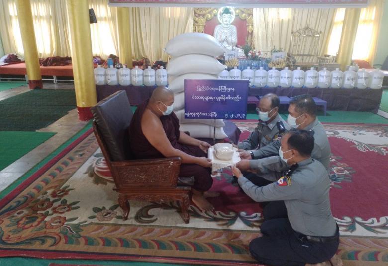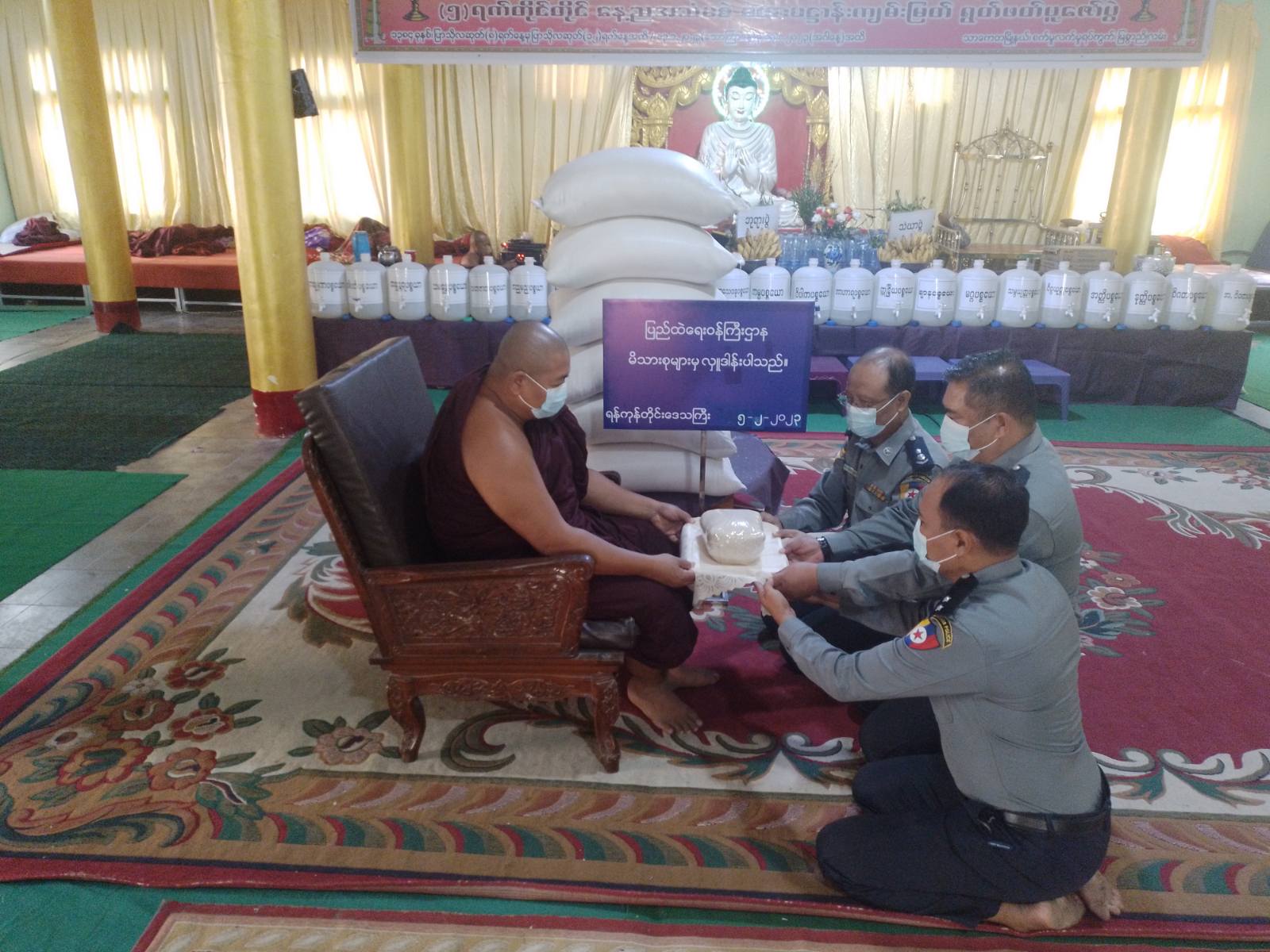 ပြည်ထဲရေးဝန်ကြီးဌာန တပ်ဖွဲ့ဝင်၊ ဝန်ထမ်းအရာထမ်း၊ အမှုထမ်းမိသားစုများက မြို့နယ်များရှိ ဘုန်းတော်ကြီးကျောင်းများသို့ ဆွမ်းဆန်တော်နှင့် ဆန်ကြာဆံများ ဆက်ကပ်လှူဒါန်း လျက်ရှိသည်။