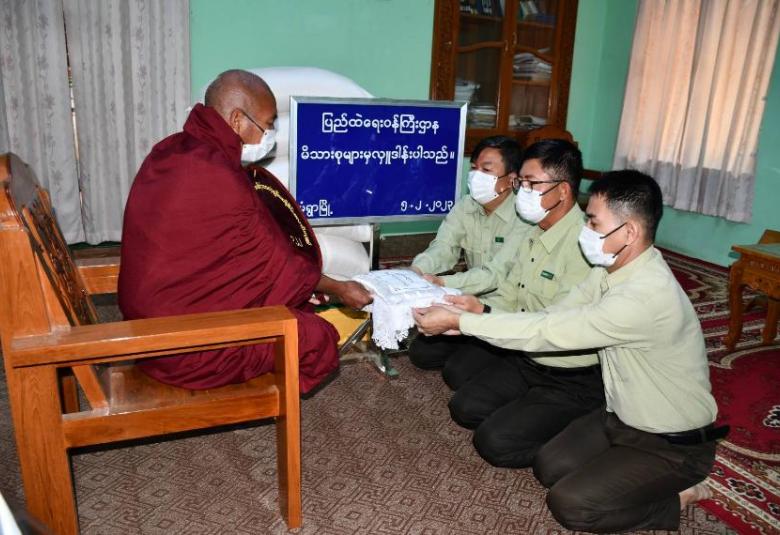 ထိုသို့ဆောင်ရွက်လျက်ရှိရာ ယနေ့တွင် နေပြည်တော်ကောင်စီနယ်မြေ ဒက္ခိဏသီရိမြို့နယ်ရှိ ရွှေမြိုင်ကျောင်းတိုက်၊ စစ်ကိုင်းတိုင်းဒေသကြီး မုံရွာမြို့နယ်ရှိ ပညာမဏ္ဍိုင်ကျောင်းတိုက်၊ မွန်ပြည်နယ် မော်လမြိုင်မြို့နယ်ရှိ မဟာမြိုင်စာသင်တိုက်၊ ရန်ကုန်တိုင်းဒေသကြီး စမ်းချောင်းမြို့နယ်ရှိ မဟာမြိုင် ဘုန်းဘုရားကျောင်းတိုက်၊ ဒဂုံမြို့သစ်(တောင်ပိုင်း)မြို့နယ်ရှိ ဂုဏ်ရည်လွင် ပရိယတ္တိစာသင်တိုက်၊ ရန်ကင်းမြို့နယ်ရှိ အောင်သုခဗိမာန်ကျောင်းတိုက်နှင့် သာကေတမြို့နယ်ရှိ ပါဠိကာရီကျောင်းတိုက်၊ ရှမ်းပြည်နယ် ကျိုင်းတုံမြို့နယ်ရှိ ကျိုင်းလဲကျောင်းတိုက်များသို့ ဆွမ်းဆန်တော်များကိုလည်းကောင်း၊ မန္တလေးတိုင်းဒေသကြီး ပြည်ကြီးတံခွန်မြို့နယ်ရှိ စက်မှု မစိုးရိမ်ကျောင်းတိုက်၊ အောင်မြေသာစံမြို့နယ်ရှိ အောင်ချမ်းသာစာသင်တိုက်၊ ရန်ကုန်တိုင်းဒေသကြီး ဗဟန်းမြို့နယ်ရှိ ဗောဓိသုခကျောင်းတိုက်၊ ရှမ်းပြည်နယ် တောင်ကြီးမြို့နယ်ရှိ သီရိမင်္ဂလာရွှေမန်း ပရိယတ္တိစာသင်တိုက်နှင့် လားရှိုးမြို့နယ်ရှိ ရွှေလရောင် ကျောင်းတိုက်များသို့ ဆန်ကြာဆံများကိုလည်းကောင်း ဆရာတော်၊ သံဃာတော်များအတွက် ပြည်ထဲရေးဝန်ကြီးဌာန၊ တပ်ဖွဲ့၊ ဦးစီးဌာနများမှ သက်ဆိုင်ရာ နေပြည်တော်ကောင်စီနယ်မြေနှင့် တိုင်းဒေသကြီးနှင့် ပြည်နယ်များရှိ တာဝန်ရှိသူများက သွားရောက်ဆက်ကပ် လှူဒါန်းခဲ့ကြကြောင်း သိရသည်။