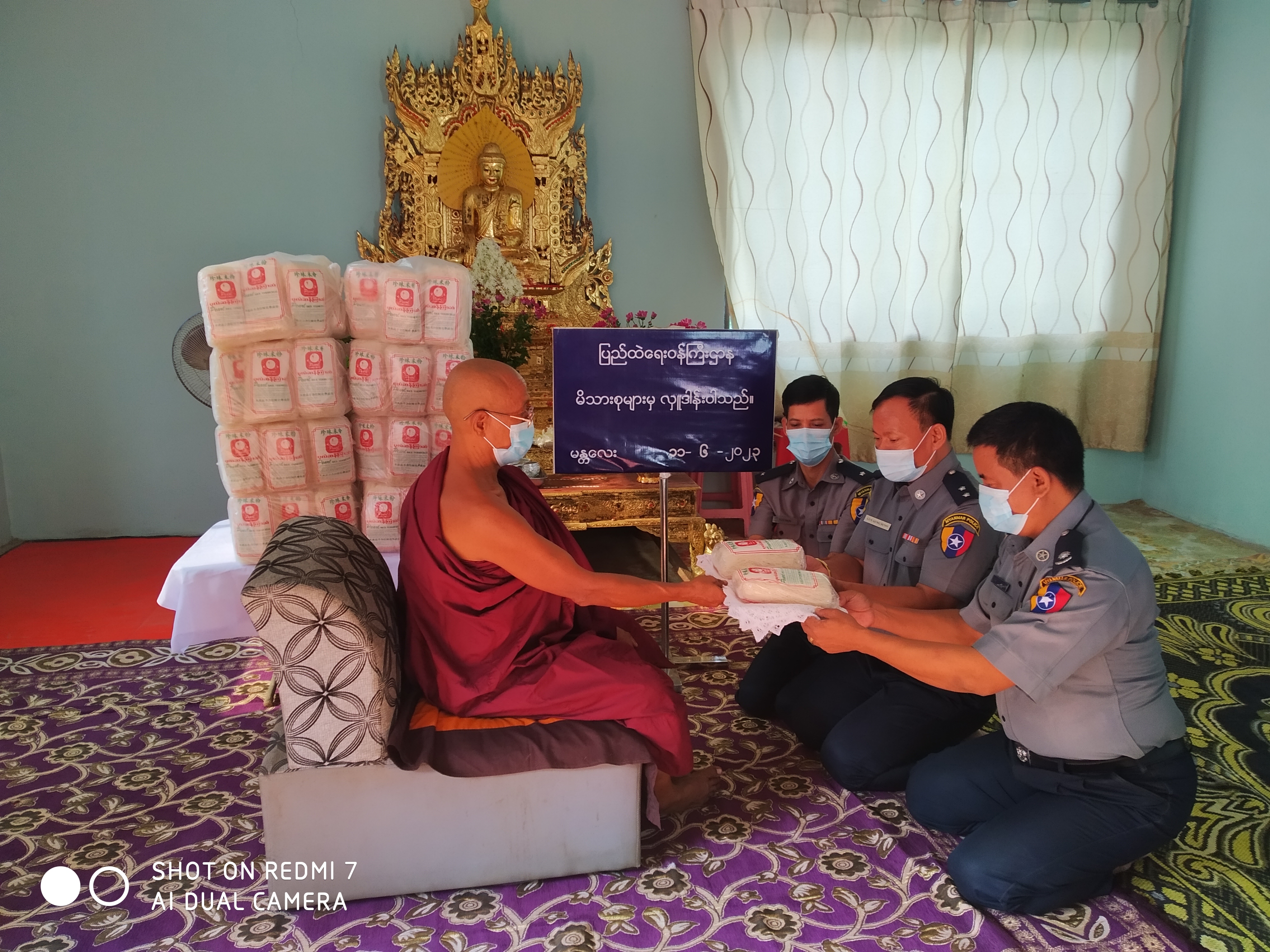 ပြည်ထဲရေးဝန်ကြီးဌာန၊ တပ်ဖွဲ့ဝင် ဝန်ထမ်း အရာထမ်း၊ အမှုထမ်းမိသားစုများက မြို့နယ်များရှိ ဘုန်းတော်ကြီးကျောင်းများသို့ ဆွမ်းဆန်တော်နှင့် ဆန်ကြာဆံများ ဆက်ကပ်လှူဒါန်းလျက်ရှိသည်။