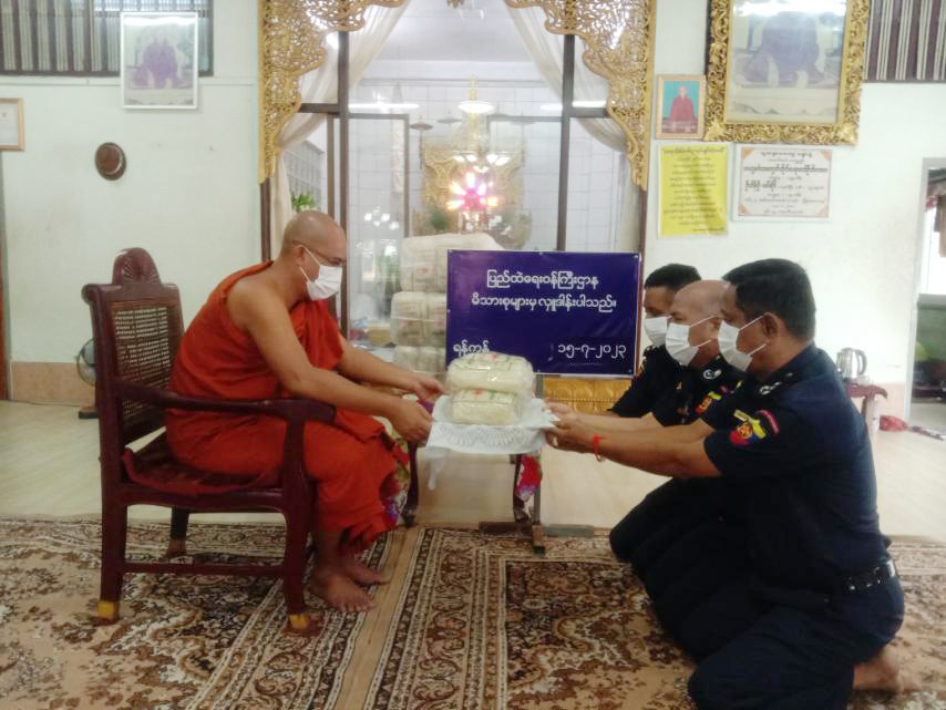 ပြည်ထဲရေးဝန်ကြီးဌာန၊ တပ်ဖွဲ့ဝင်/ ဝန်ထမ်း အရာထမ်း၊ အမှုထမ်းမိသားစုများက မြို့နယ် များရှိ ဘုန်းတော်ကြီးကျောင်းများသို့ ဆွမ်းဆန်တော်နှင့် ဆန်ကြာဆံများဆက်ကပ်လှူဒါန်း လျက်ရှိသည်။