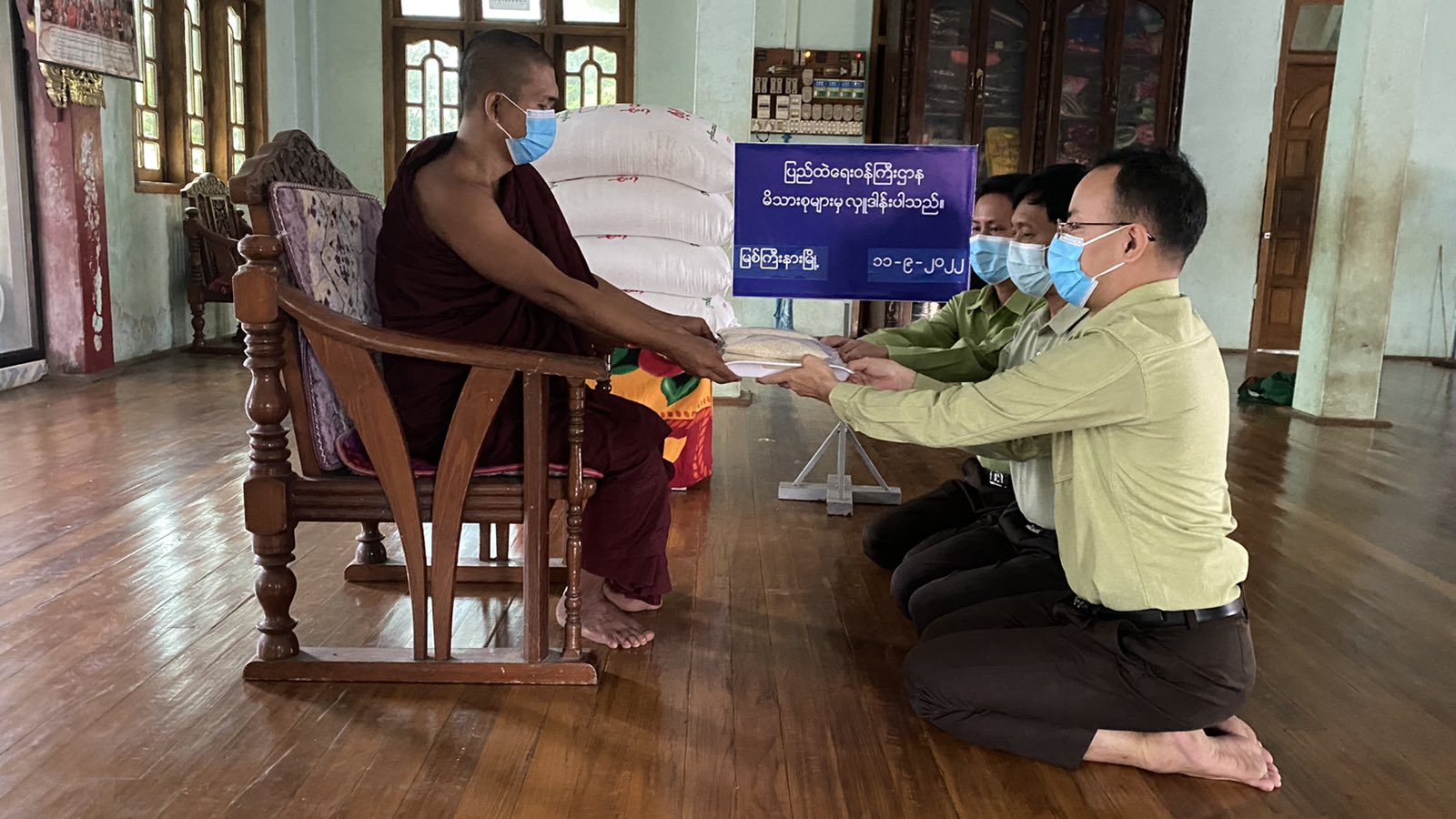 ထိုသို့ဆောင်ရွက်လျက်ရှိရာ ယနေ့တွင် နေပြည်တော်ကောင်စီနယ်မြေ၊ ပျဉ်းမနားမြို့နယ်ရှိ မာရ်အောင်ကျောင်းတိုက်၊ ကချင်ပြည်နယ်၊ မြစ်ကြီးနားမြို့နယ်ရှိ အဘယာရာမ စာသင်တိုက်၊ ကရင်ပြည်နယ်၊ ဘားအံမြို့နယ်ရှိ မြိုင်သဇင်ကျောင်းတိုက်၊ မွန်ပြည်နယ်၊ မော်လမြိုင်မြို့နယ်ရှိ ရာမညရဋ္ဌ ဗုဒ္ဓတက္ကသိုလ်၊ ရန်ကုန်တိုင်းဒေသကြီး၊ ဒဂုံမြို့သစ် (အရှေ့ပိုင်း) မြို့နယ်ရှိ ဒဂုံပရိယတ္တိစာသင်တိုက်နှင့် မရမ်းကုန်းမြို့နယ်ရှိ နိုင်ငံတော်ပရိယတ္တိ သာသနာ့တက္ကသိုလ်၊ ရှမ်းပြည်နယ်၊ ကျိုင်းတုံမြို့နယ်ရှိ ကျောင်းလုံသီရိနော် ကျောင်းတိုက်တို့သို့ ဆွမ်းဆန်တော်များကိုလည်းကောင်း၊ ပဲခူးတိုင်းဒေသကြီး၊ ပဲခူးမြို့နယ်ရှိ သာသနာ့မဏ္ဍိုင် ပါဠိတက္ကသိုလ်ကျောင်းတိုက်၊ မကွေးတိုင်းဒေသကြီး၊ မကွေးမြို့နယ်ရှိ မင်္ဂလာသာစည်ကျောင်းတိုက်၊ မန္တလေးတိုင်းဒေသကြီး၊ ချမ်းအေးသာစံမြို့နယ်ရှိ မဟာဝိဇိတာရုံ ကျောင်းတိုက်နှင့် အောင်မြေသာစံမြို့နယ်ရှိ သစ်ဆိမ့်ကျောင်းတိုက်၊ ရခိုင်ပြည်နယ်၊ စစ်တွေမြို့ နယ်ရှိ တပ်ဦးဆုတောင်းပြည့် ပရိယတ္တိစာသင်တိုက်၊ ရှမ်းပြည်နယ်၊ တောင်ကြီးမြို့နယ်ရှိ အေးစေတီ ကျောင်းတိုက်တို့သို့ ဆန်ကြာဆံများကိုလည်းကောင်း ဆရာတော်၊ သံဃာတော်များအတွက် တာဝန်ရှိသူများက သွားရောက်ဆက်ကပ်လှူဒါန်းခဲ့ကြကြောင်း သိရသည်။