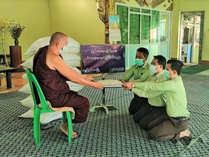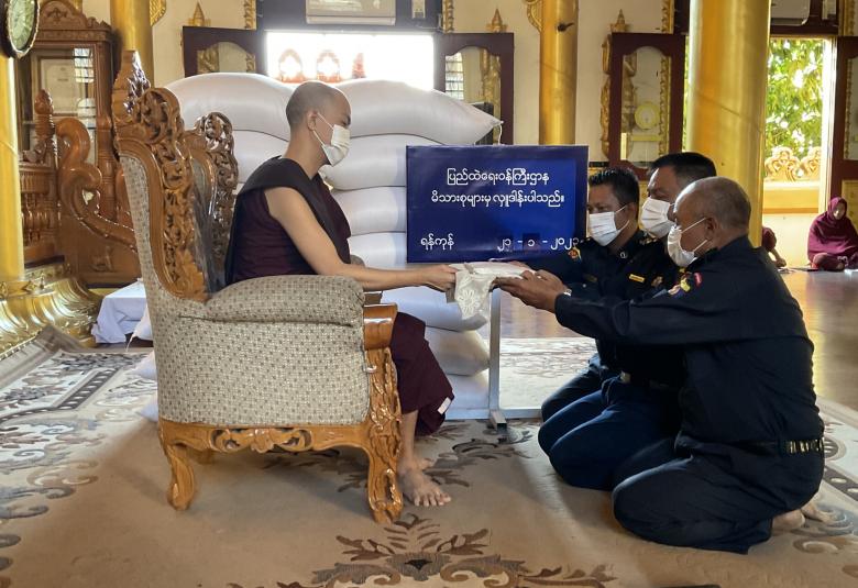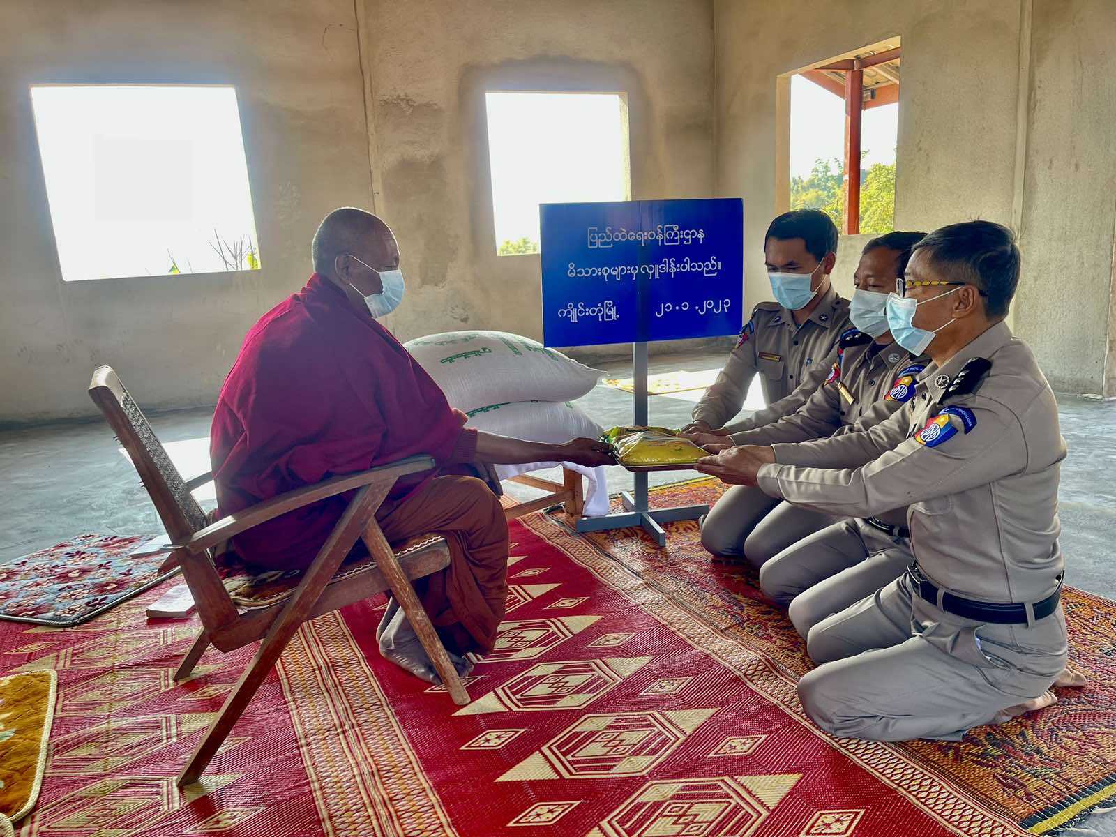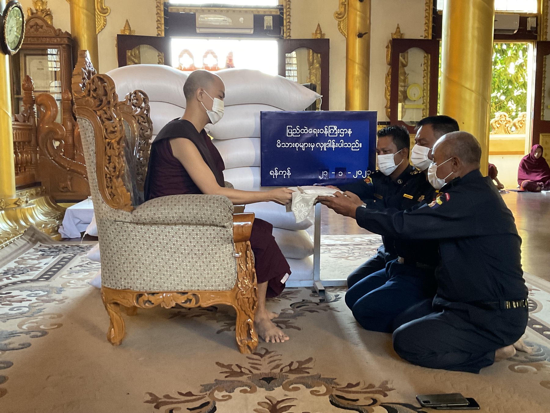 ထိုသို့ဆောင်ရွက်လျက်ရှိရာ ယနေ့တွင် နေပြည်တော်ကောင်စီနယ်မြေ၊ ပျဉ်းမနားမြို့နယ်ရှိ ကူးတို့ဆိပ်ကျောင်းတိုက်၊ စစ်ကိုင်းတိုင်းဒေသကြီး၊ မုံရွာမြို့နယ်ရှိ မြို့မရွှေကြာရုံ ကျောင်းတိုက်၊ ပဲခူးတိုင်းဒေသကြီး၊ ပဲခူးမြို့နယ်ရှိ သာသနာ့ရက္ခိတကျောင်းတိုက်၊ မွန်ပြည် နယ်၊ မော်လမြိုင်မြို့နယ်ရှိ ရာမညနိကာယ ဘာသာသနာ့ရက္ခိတပရိယတ္တိမွန် ကျောင်းတိုက်၊ ရန်ကုန်တိုင်းဒေသကြီး၊ ဒဂုံမြို့သစ်(မြောက်ပိုင်း)မြို့နယ်ရှိ ထေရဝါဒဓမ္မရောင်ခြည် ပရိယတ္တိ စာသင်တိုက်၊ မင်္ဂလာဒုံမြို့နယ်ရှိ မဟာအတုလ ဝေယံဘုံသာတိပိဋက ရွှေပါရမီကျောင်းတိုက်၊ ရွှေပြည်သာမြို့နယ်ရှိ ပညာပါရမီကျောင်းတိုက်နှင့် ရှမ်းပြည်နယ်၊ ကျိုင်းတုံမြို့နယ်ရှိ ပုဗ္ဗာရုံ ကျောင်းတိုက်တို့သို့ ဆွမ်းဆန်တော်များကိုလည်းကောင်း၊ ကရင်ပြည်နယ်၊ ဘားအံမြို့နယ်ရှိ သရက်တောကျောင်းတိုက်၊ မကွေးတိုင်းဒေသကြီး၊ မကွေးမြို့နယ်ရှိ ပညာစက္ကရာမကျောင်း တိုက်၊ မန္တလေးတိုင်းဒေသကြီး၊ ပြည်ကြီးတံခွန်မြို့နယ်ရှိ မိုးကုတ်ရိပ်သာ (မြောက်)ကျောင်းတိုက်နှင့် အောင်မြေသာစံမြို့နယ်ရှိ နဂါးပရိယတ္တိစာသင်တိုက်၊ ရှမ်းပြည်နယ်၊ တောင်ကြီးမြို့နယ်ရှိ နောင်အင်ပရိယတ္တိစာသင်တိုက်နှင့် လားရှိုးမြို့နယ်ရှိ လွယ်ဝိန်းတောရကျောင်းတိုက်တို့သို့ ဆန်ကြာဆံများကိုလည်းကောင်း ဆရာတော်၊ သံဃာတော်များအတွက် ပြည်ထဲရေးဝန်ကြီးဌာန၊ တပ်ဖွဲ့နှင့် ဦးစီးဌာနများမှ သက်ဆိုင်ရာနေပြည်တော်ကောင်စီ၊ တိုင်းဒေသကြီး နှင့်ပြည်နယ်များရှိ တာဝန်ရှိသူများက သွားရောက်ဆက်ကပ်လှူဒါန်းခဲ့ကြကြောင်း သိရသည်။