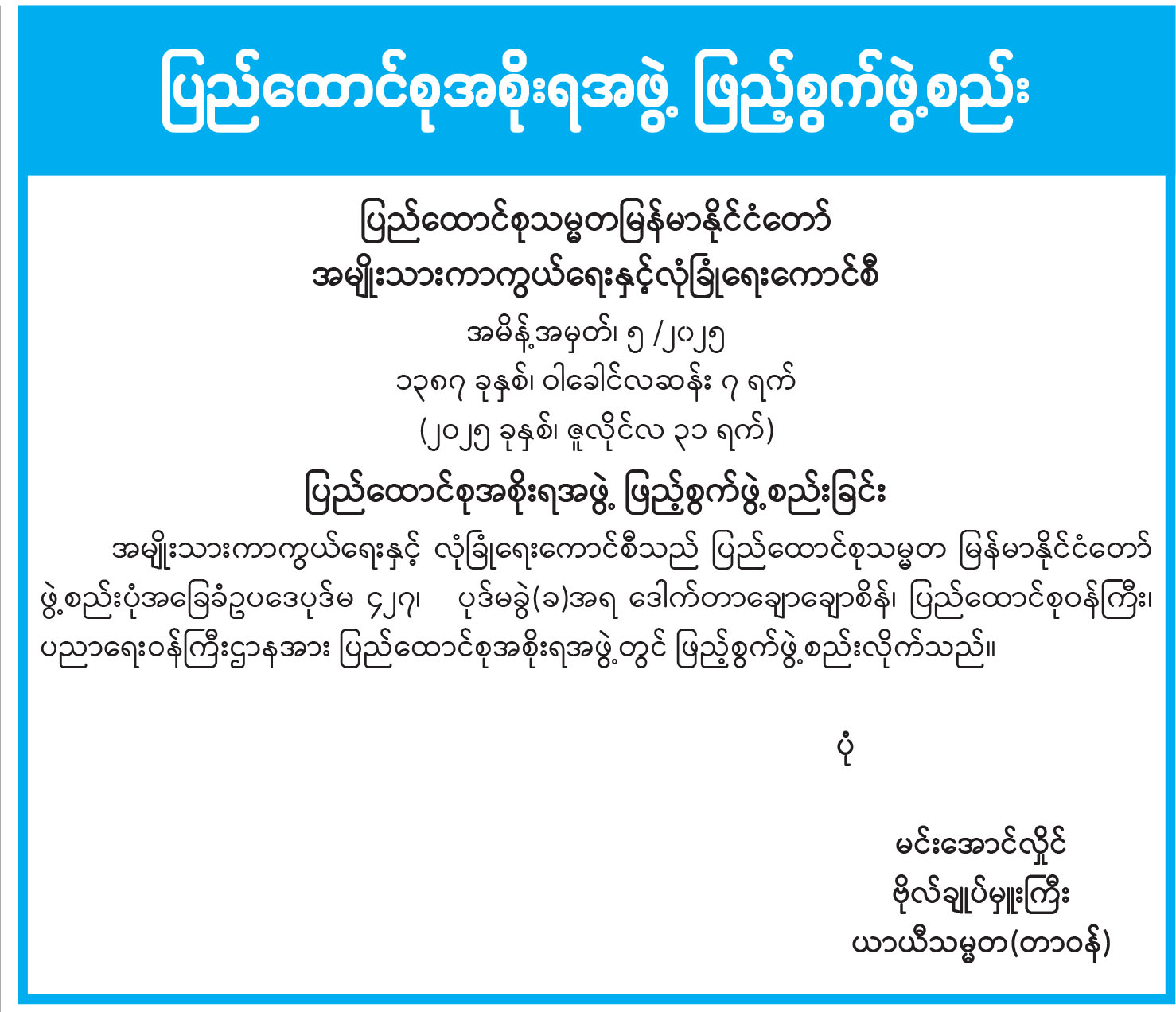 ပြည်ထောင်စုသမ္မတမြန်မာနိုင်ငံတော် ယာယီသမ္မတ နိုင်ငံတော်လုံခြုံရေးနှင့် အေးချမ်းသာယာရေး ကော်မရှင်ဥက္ကဋ္ဌ ဗိုလ်ချုပ်မှူးကြီး သတိုးမဟာသရေစည်သူ သတိုးသီရိသုဓမ္မ မင်းအောင်လှိုင်ထံမှ (၇၄) နှစ်မြောက် ကယားပြည်နယ်နေ့အခမ်းအနားသို့ပေးပို့သည့် သဝဏ်လွှာ
