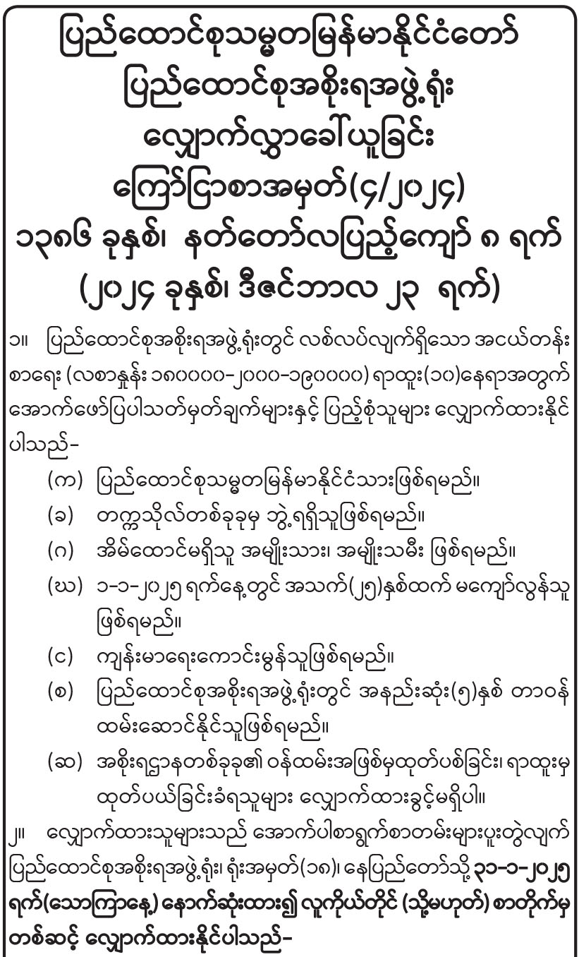 ပြည်ထောင်စုအစိုးရအဖွဲ့ရုံးတွင် လစ်လပ်လျက်ရှိသော အငယ်တန်းစာရေး ရာထူး (၁၀) နေရာအတွက် ဖော်ပြပါသတ်မှတ်ချက်များနှင့် ပြည့်စုံသူများ လျှောက်ထားနိုင်