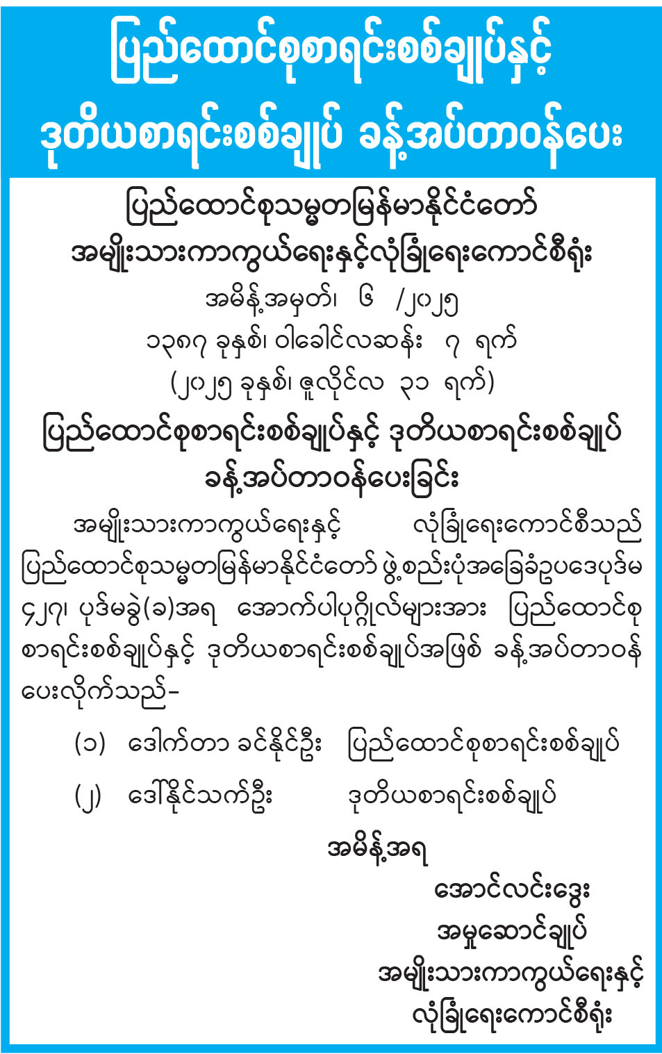 ပြည်ထောင်စုစာရင်းစစ်ချုပ်နှင့် ဒုတိယစာရင်းစစ်ချုပ် ခန့်အပ်တာဝန်ပေး