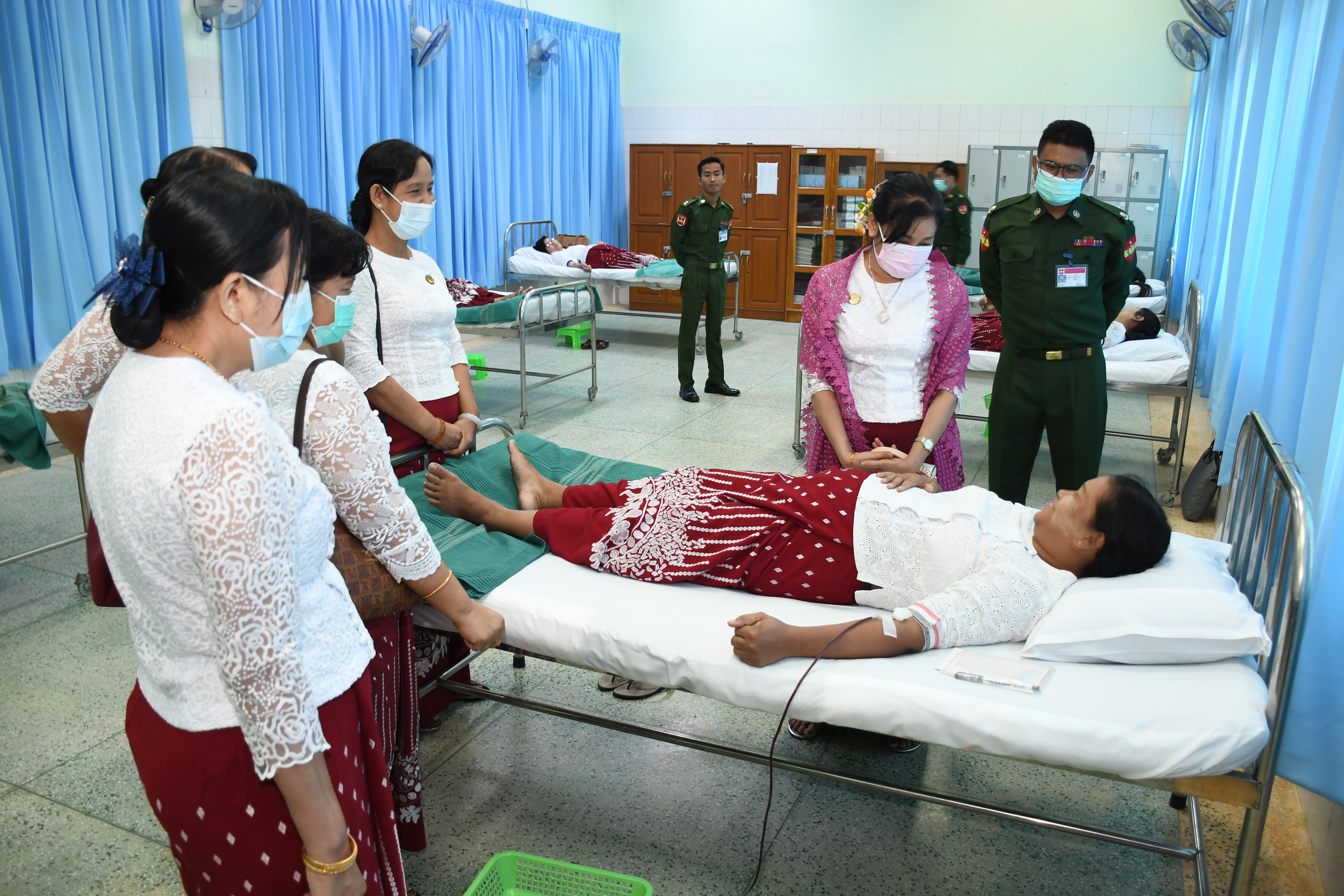 သွေးလှူဒါန်းပွဲတွင် ပြည်ထောင်စုစာရင်းစစ်ချုပ်ရုံးဝန်ထမ်း(၂၉)ဉီးက သွေးလှူဒါန်းခဲ့ကြရာ ဒုတိယ စာရင်းစစ်ချုပ် ဒေါ်နိုင်သက်ဦးနှင့် တာဝန်ရှိသူများက သွေးလှူဒါန်းသည့် ဝန်ထမ်းများကို ကြည့်ရှု အားပေးပြီး ကြက်ဉ၊ နွားနို့၊ မုန့်နှင့် အချိုရည်စသည့် အားဖြည့်ဓာတ်စာများ ပေးအပ်ကြသည်။