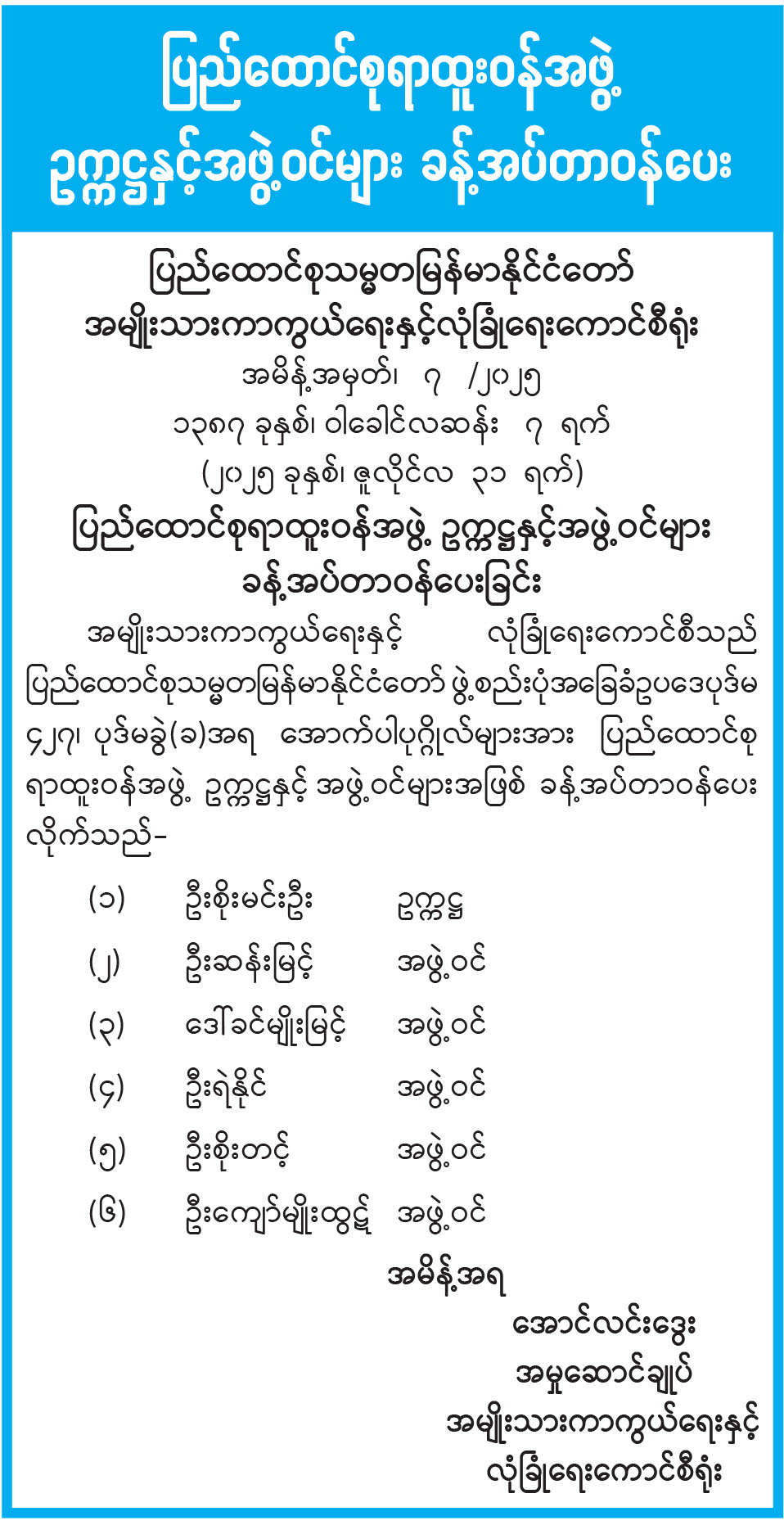 ပြည်ထောင်စုရာထူးဝန်အဖွဲ့ဥက္ကဋ္ဌနှင့်အဖွဲ့ဝင်များ ခန့်အပ်တာဝန်ပေး