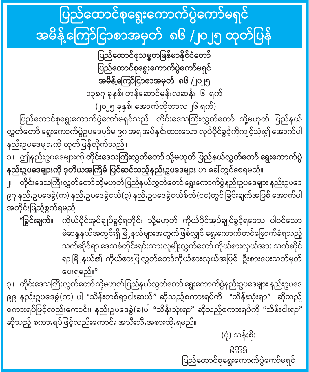 ပြည်ထောင်စုရွေးကောက်ပွဲကော်မရှင် အမိန့်ကြော်ငြာစာအမှတ် ၈၆ / ၂၀၂၅ ထုတ်ပြန်