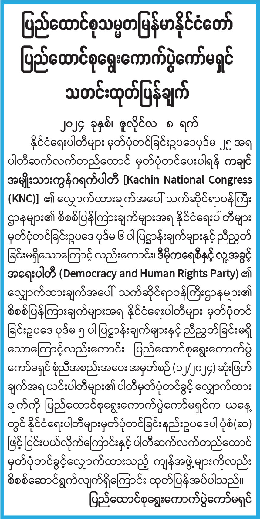 ပြည်ထောင်စုရွေးကောက်ပွဲကော်မရှင် သတင်းထုတ်ပြန်ချက်