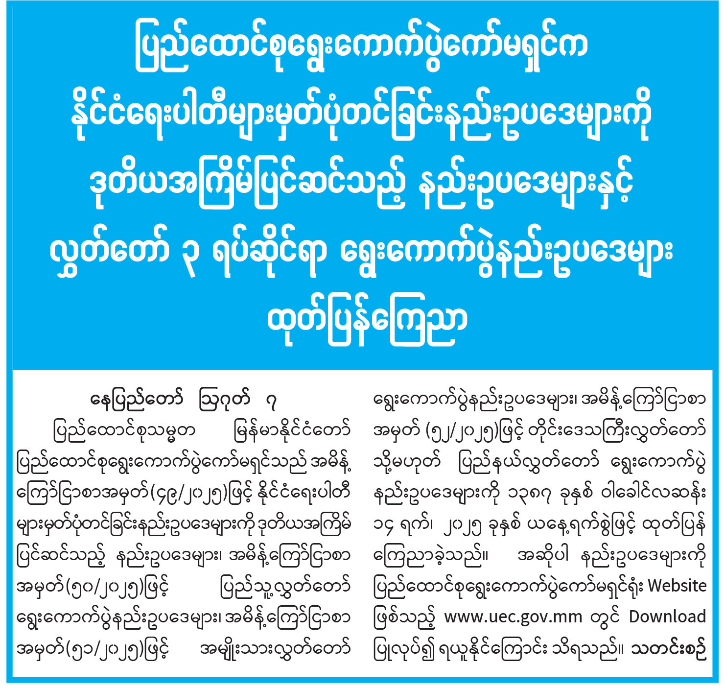 ပြည်ထောင်စုရွေးကောက်ပွဲကော်မရှင်က နိုင်ငံရေးပါတီများမှတ်ပုံတင်ခြင်းနည်းဥပဒေများကို ဒုတိယအကြိမ်ပြင်ဆင်သည့် နည်းဥပဒေများနှင့် လွှတ်တော် ၃ ရပ်ဆိုင်ရာ ရွေးကောက်ပွဲနည်းဥပဒေများ ထုတ်ပြန်ကြေညာ