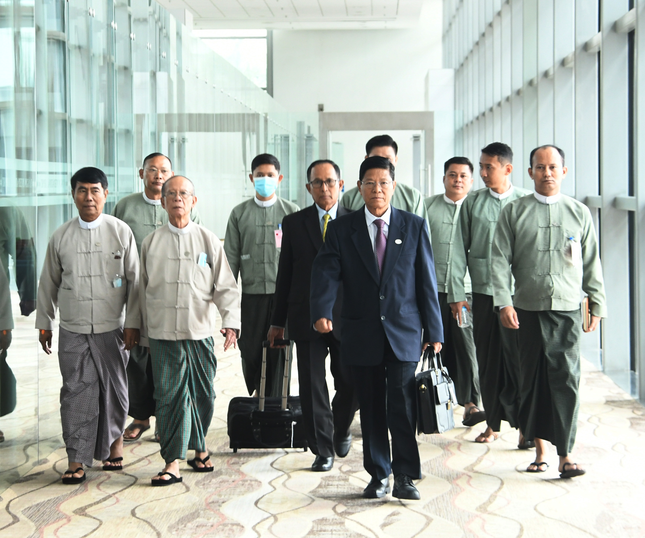 ပြည်ထောင်စုရွေးကောက်ပွဲကော်မရှင် ဥက္ကဋ္ဌနှင့်အဖွဲ့အား ကော်မရှင်အဖွဲ့ဝင်များဖြစ်ကြသည့် ဦးသန်းထွန်း၊ ဦးအောင်စောဝင်းနှင့် ရန်ကုန်တိုင်းဒေသကြီး ရွေးကောက်ပွဲကော်မရှင်အဖွဲ့ခွဲမှ တာဝန်ရှိသူများက ရန်ကုန် အပြည်ပြည်ဆိုင်ရာလေဆိပ်၌ ပို့ဆောင်နှုတ်ဆက်ကြသည်။