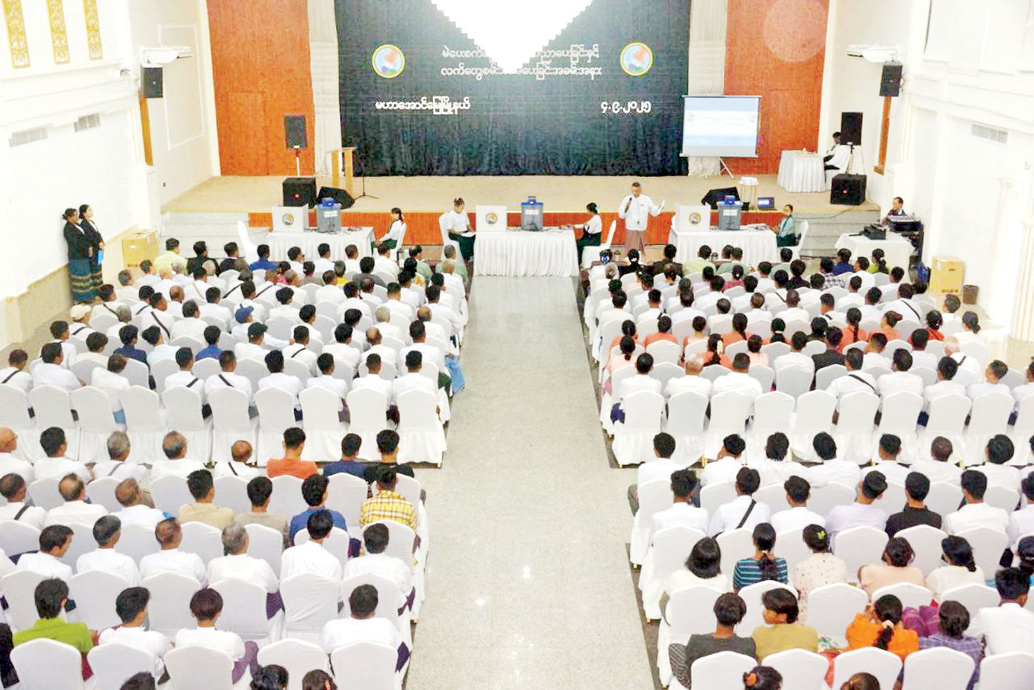 မွန်းလွဲပိုင်းတွင် မန္တလေးတိုင်းဒေသကြီး မန္တလေးခရိုင်ရွေးကောက်ပွဲကော်မရှင်အဖွဲ့ခွဲများမှ ဥက္ကဋ္ဌများ၊ အဖွဲ့ဝင်များနှင့် ကော်မရှင်အဖွဲ့ခွဲရုံး ဝန်ထမ်းများနှင့်တွေ့ဆုံ၍ ပြည်ထောင်စုရွေးကောက်ပွဲကော်မရှင်ဥက္ကဋ္ဌက ကျင်းပပြုလုပ်မည့် ရွေးကောက်ပွဲတွင် ယခင်ကျင့်သုံးခဲ့သည့် နိုင်သူအကုန်ယူစနစ်(FPTP) အပြင် FPTP နှင့် PR စနစ် ပေါင်းစပ်ထားသည့် ရောနှောထားသော ကိုယ်စားလှယ်အချိုးကျစနစ် (Mixed Member Proportional-MMP)ကို အသုံးပြုဆောင်ရွက်သွားမည့်အခြေအနေနှင့် မဲဆန္ဒနယ်များကို စနစ်တကျသတ်မှတ်ထားမှုအခြေအနေများကို ရှင်းလင်းပြောကြားပြီး ကြိုတင်ဆန္ဒမဲများ စနစ်တကျ ပေးနိုင်ရေးနှင့်မဲပေးရာတွင် အပိုင်းလိုက် MEVM စက်ဖြင့် မဲပေးနိုင်ရေးအတွက် MEVM စက်များ စနစ်တကျသယ်ယူရွှေ့ပြောင်းရန်၊ MEVM ကြီးကြပ်မှုနှင့် နည်းပညာအထောက်အကူပြုအဖွဲ့များကို စနစ်တကျ ဖွဲ့စည်းလေ့ကျင့်ဆောင်ရွက်ရန်၊ ရွေးကောက်ပွဲနေ့မတိုင်မီ MEVM စက်အသုံးပြု၍ လေ့လာစမ်းသပ်မဲပေးမှုများဆောင်ရွက်ရန်နှင့် ရွေးကောက်ပွဲဆိုင်ရာ လုပ်ငန်းလိုအပ်ချက်များကို ဆွေးနွေးမှာကြားသည်။