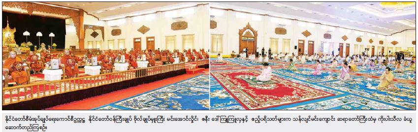 ဦးစွာ နိုင်ငံတော်စီမံအုပ်ချုပ်ရေးကောင်စီဥက္ကဋ္ဌ နိုင်ငံတော်ဝန်ကြီးချုပ်က သာသနာ့မဟာဗိမာန်တော်ကြီးအတွင်းရှိ ဗုဒ္ဓရုပ်ပွားတော်မြတ်အား ဖူးမြော်ကြည်ညို၍ မြသပိတ်ဆွမ်းတော်၊ သစ်သီး၊ ပန်း၊ သောက်တော်ရေချမ်းနှင့် ဆီမီးတို့ကို ဆက်ကပ်လှူဒါန်းသည်။