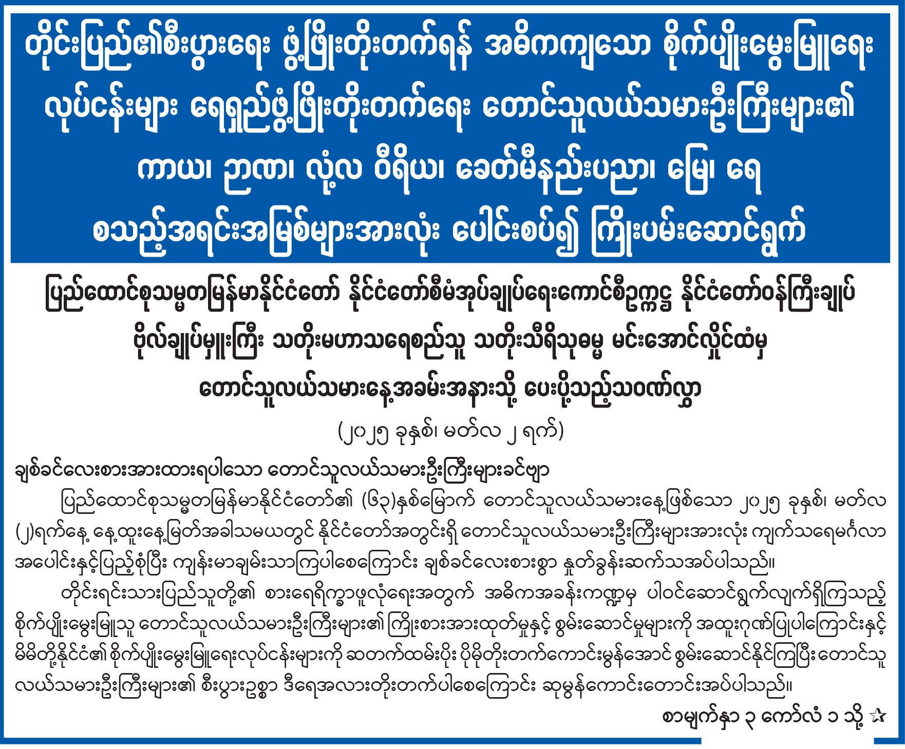 ပြည်ထောင်စုသမ္မတမြန်မာနိုင်ငံတော် နိုင်ငံတော်စီမံအုပ်ချုပ်ရေးကောင်စီဥက္ကဋ္ဌ နိုင်ငံတော်ဝန်ကြီးချုပ် ဗိုလ်ချုပ်မှူးကြီး သတိုးမဟာသရေစည်သူ သတိုးသီရိသုဓမ္မ မင်းအောင်လှိုင်ထံမှ တောင်သူလယ်သမားအခမ်းအနားသို့ ပေးပို့သည့်သဝဏ်လွှာ
