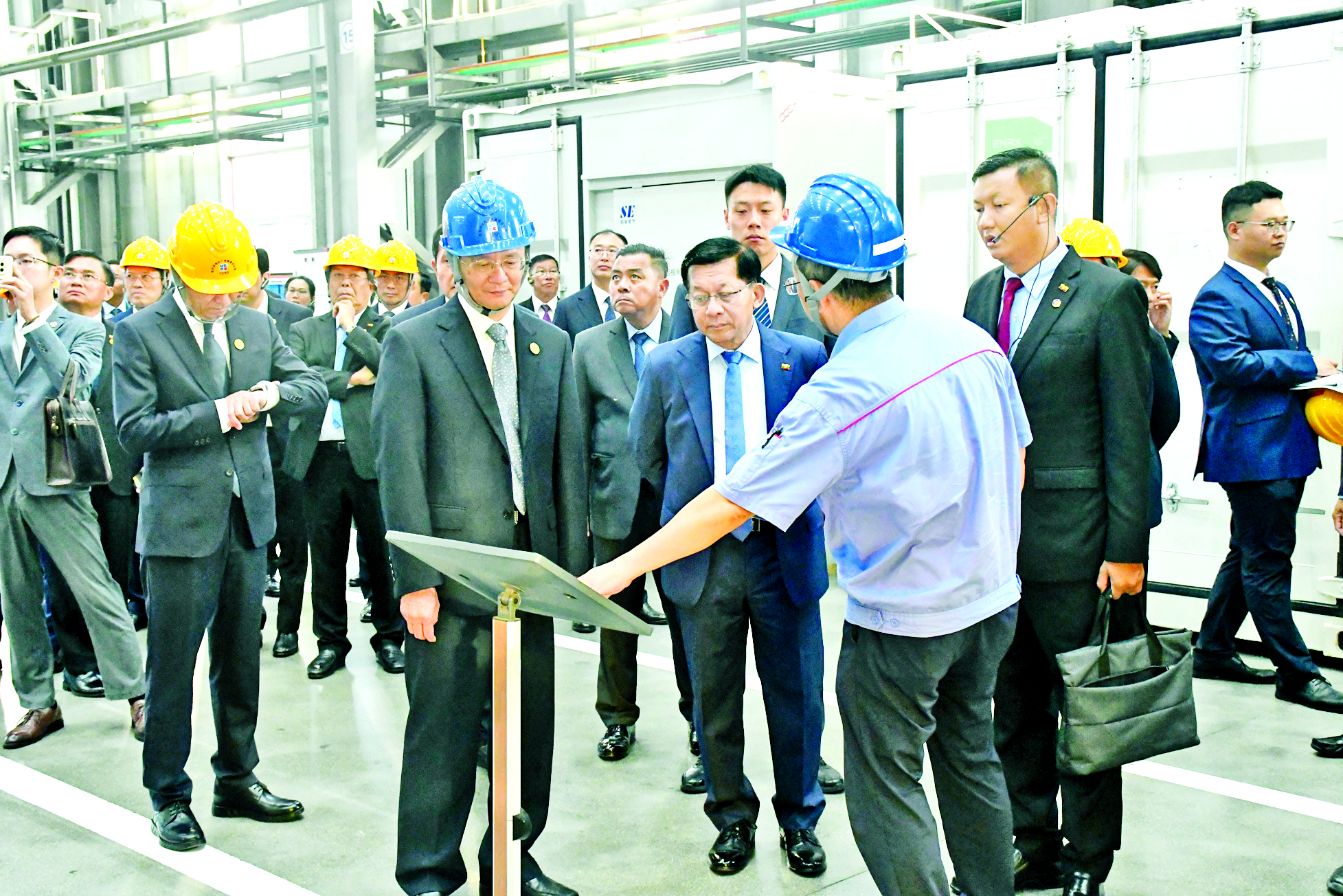 ဆက်လက်၍ စက်ရုံအတွင်း Ai စနစ်အသုံးပြု၍ စက်ပစ္စည်း ကိရိယာများ ထုတ်လုပ်နေမှုအခြေ အနေများကို လှည့်လည်ကြည့်ရှု လေ့လာကြပြီး တာဝန်ရှိသူများ၏ တင်ပြချက်များအပေါ် ပြည်ထောင်စုသမ္မတ မြန်မာနိုင်ငံတော်ယာယီသမ္မတ နိုင်ငံတော်လုံခြုံရေးနှင့် အေးချမ်းသာယာရေး ကော်မရှင်ဥက္ကဋ္ဌက မြန်မာနိုင်ငံတွင် ရေအားလျှပ်စစ်ထုတ်လုပ်ခြင်းလုပ်ငန်းများ ဆောင်ရွက်မှုတွင် ပူးပေါင်းဆောင်ရွက်နိုင်မှု အခြေအနေများကို ရှင်းလင်း ပြောကြားသည်။