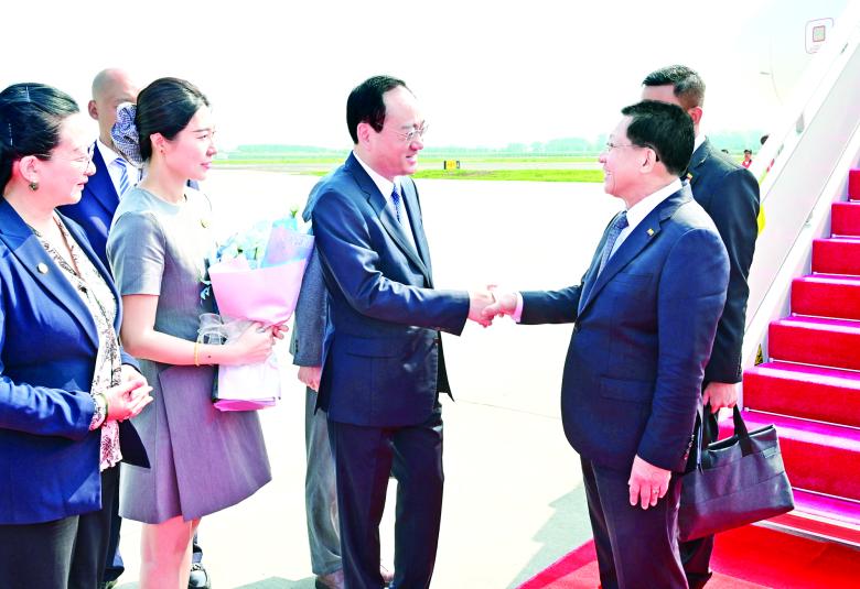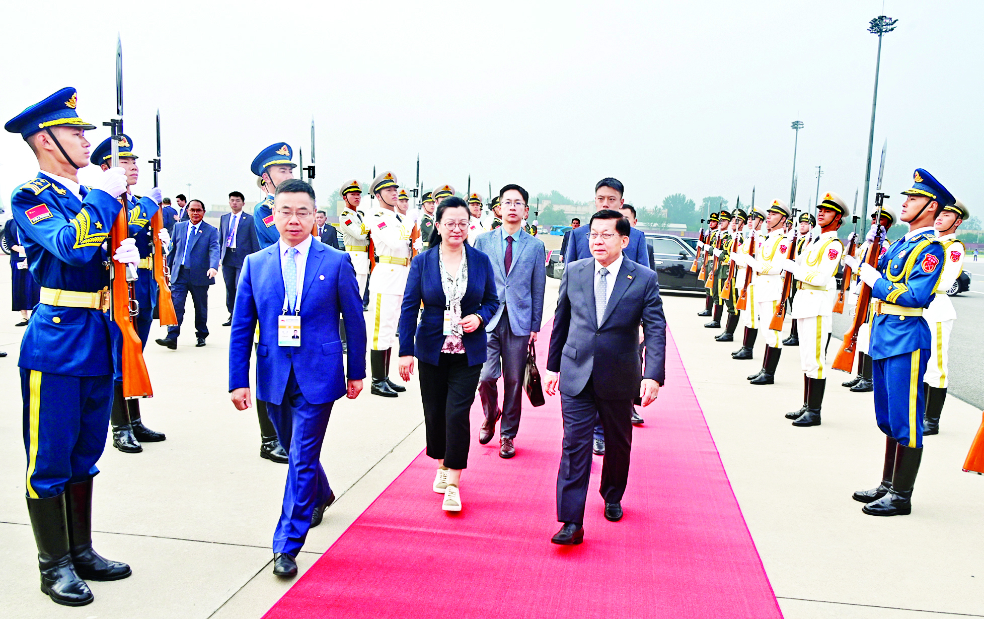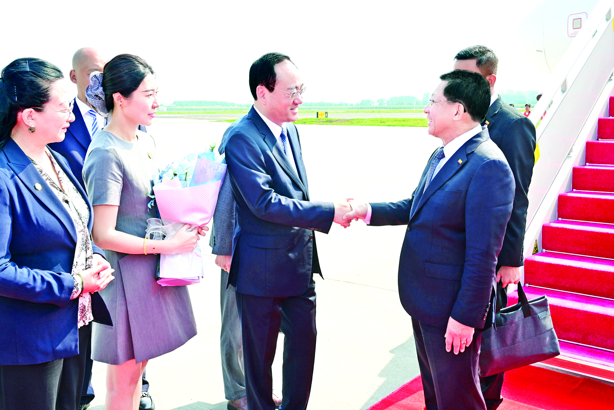ယင်းနောက် ပြည်ထောင်စု သမ္မတမြန်မာနိုင်ငံတော် ယာယီသမ္မတ နိုင်ငံတော်လုံခြုံရေးနှင့် အေးချမ်း သာယာရေးကော်မရှင် ဥက္ကဋ္ဌ ဗိုလ်ချုပ်မှူးကြီး မင်းအောင်လှိုင် ဦးဆောင်သည့် ကိုယ်စားလှယ် အဖွဲ့သည် ဒေသစံတော်ချိန် နံနက် ၉ နာရီခွဲ တွင် ဟာပင်းမြို့ Taiping International Airport သို့ ရောက်ရှိကြရာ တရုတ်အစိုးရမှ ဒုတိယဝန်ကြီးအဆင့်ရှိသူတစ်ဦးနှင့် တာဝန်ရှိသူများက လေဆိပ်တွင် ကြိုဆိုနှုတ်ဆက်ကြသည်။