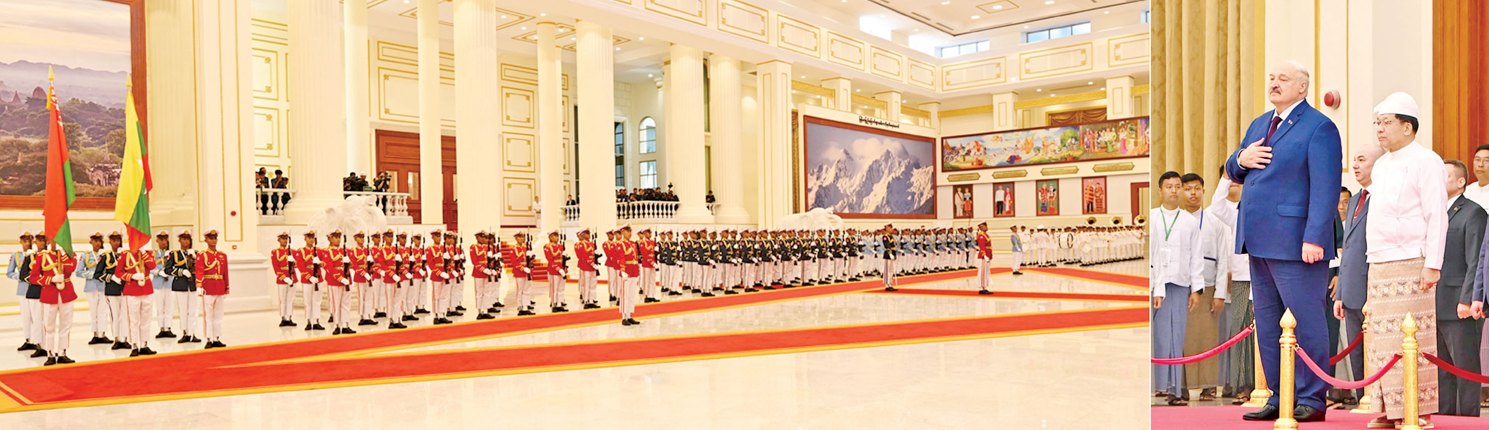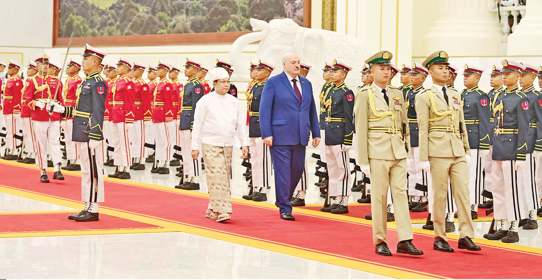 ပြည်ထောင်စုသမ္မတ မြန်မာနိုင်ငံတော် ယာယီသမ္မတ နိုင်ငံတော်လုံခြုံရေးနှင့် အေးချမ်းသာယာရေးကော်မရှင် ဥက္ကဋ္ဌ ဗိုလ်ချုပ်မှူးကြီး မင်းအောင်လှိုင်သည်မြန်မာနိုင်ငံ၌ တရားဝင်ချစ်ကြည်ရေးခရီးရောက်ရှိနေသည့် ဘယ်လာရုစ်သမ္မတနိုင်ငံ သမ္မတ H.E. Mr. Aleksandr Lukashenko အား ယနေ့နံနက်ပိုင်းတွင် သမ္မတအိမ်တော် ဆင်ဖြူတော်ဆောင်ဧည့်ခန်းမ၌ ဂုဏ်ပြုတပ်ဖွဲ့ဖြင့် ကြိုဆိုသည်။