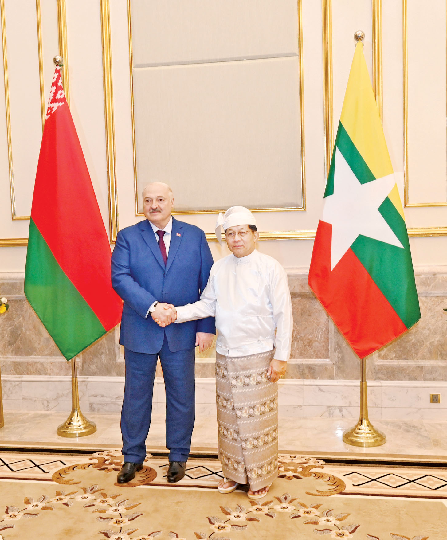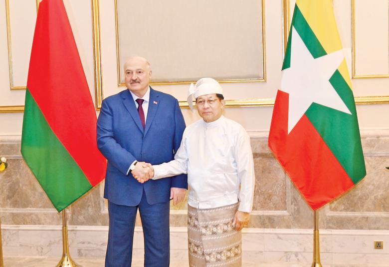 ဆက်လက်၍ နိုင်ငံတော် ယာယီသမ္မတ နိုင်ငံတော်လုံခြုံရေးနှင့် အေးချမ်းသာယာရေးကော်မရှင်ဥက္ကဋ္ဌနှင့် ဘယ်လာရုစ်သမ္မတနိုင်ငံ သမ္မတတို့သည် နှစ်နိုင်ငံအကြား စီးပွားရေးဆိုင်ရာ ပူးပေါင်းဆောင်ရွက်မှုများနှင့် ရင်းနှီးမြှုပ်နှံမှုများကို ဆက်လက်တိုးမြှင့်ဆောင်ရွက်သွားနိုင်မည့်အခြေအနေများ၊ ပညာရေး၊ ကျန်းမာရေး၊ စက်မှု၊ စိုက်ပျိုး မွေးမြူရေးနှင့် စစ်ဘက်နည်းပညာဆိုင်ရာ စသည့် နယ်ပယ်အသီးသီးတွင် ပူးပေါင်းဆောင်ရွက်မှုများကို မြှင့်တင်ဆောင်ရွက်သွားမည့် အခြေအနေများ၊ မြန်မာနိုင်ငံအစိုးရအနေဖြင့် နိုင်ငံတကာနှင့် တစ်ကမ္ဘာလုံးကို အန္တရာယ်ပေးနေသည့် အွန်လိုင်းလိမ်လည်မှုများ၊ အွန်လိုင်းလောင်းကစားမှုများ တိုက်ဖျက်ရေးလုပ်ငန်းစဉ်များကို အမျိုးသား ရေး တာဝန်တစ်ရပ်အနေဖြင့် အလေးထားတိုက်ဖျက်ဆောင်ရွက်လျက်ရှိမှု၊ ယခုအခါ မြန်မာ-ထိုင်း နယ်စပ်တွင်ရှိနေသည့် အွန်လိုင်းလောင်းကစားမှုများသည် သမားရိုးကျမဟုတ်သည့် လုံခြုံရေးဆိုင်ရာစိန်ခေါ်ချက်ဖြစ်သဖြင့် သတိထားဆောင်ရွက် လျက်ရှိမှု၊ ယင်းလုပ်ငန်းသည် ကိုဗစ်-၁၉ ကာလနောက်ပိုင်း ၂၀၂၀ ပြည့်နှစ်မှ စတင်ကျယ်ပြန့်လာမှု၊ ၂၀၂၁ ခုနှစ် မြန်မာနိုင်ငံတွင် နိုင်ငံရေးမတည်ငြိမ်မှုဖြစ်လာချိန်၌ နယ်စပ်ဒေသများတွင် တည်ငြိမ်မှုနှင့် တရားဥပဒေစိုးမိုးမှု လျော့နည်းလာသည်ကို အခွင့်ကောင်းယူပြီး တရားမဝင်လက်နက်ကိုင်အဖွဲ့များနှင့် ပူးပေါင်း၍ အွန်လိုင်းလောင်းကစားမှုကို အခြေချခဲ့မှု၊ အွန်လိုင်းလောင်းကစားမှုပြုလုပ်သည့်နေရာများမှ ဖမ်းဆီးရမိသူ နိုင်ငံပေါင်း ၅၂ နိုင်ငံမှ ပြည်ပနိုင်ငံသား ၇၀၀၀၀ နီးပါးခန့်ကို ထိန်းသိမ်း၍ မိခင်နိုင်ငံသို့ ပြန်ပို့လျက်ရှိမှု၊ ကျန်ရှိသည့် ပြည်ပနိုင်ငံသား ၁၀၀၀ ခန့်ကိုလည်း ပြန်ပို့ရန် ဆောင်ရွက်လျက်ရှိမှုနှင့် အွန်လိုင်းလိမ်လည်လောင်းကစားမှုများ လုံးဝပြန်လည် အခြေမချနိုင်စေရေး၊ ဒုစရိုက်လုပ်ငန်းများ ထပ်မံမလုပ်ဆောင်နိုင်စေရေးအတွက် တရားမဝင်ဆောက်လုပ်ထားသည့် အဆောက်အအုံများကိုလည်း အပြီးတိုင် ဖျက်ဆီးဖြိုချမှုများ ဆောင်ရွက်လျက်ရှိပြီး အမြစ်ပြတ်ချေမှုန်းသွားမည့် အခြေအနေများ၊ မြန်မာနိုင်ငံတွင် ပါတီစုံဒီမိုကရေစီ အထွေထွေရွေးကောက်ပွဲတစ်ရပ်ကို မကြာမီကာလအတွင်း ကျင်းပပြုလုပ်သွားမည်ဖြစ်ပြီး ဘယ်လာရုစ်နိုင်ငံမှလည်း လေ့လာစောင့်ကြည့်ရေးအဖွဲ့ စေလွှတ်သွားမည့် အခြေအနေများ၊ နှစ်နိုင်ငံအကြား ချစ်ကြည်ရင်းနှီးမှုနှင့် ပူးပေါင်းဆောင်ရွက်မှုများကို ကဏ္ဍပေါင်းစုံ၌ ဆက်လက်တိုးမြှင့် ဆောင်ရွက်သွားမည့်အခြေအနေများနှင့် စပ်လျဉ်း၍ ရင်းနှီးပွင့်လင်းစွာအမြင်ချင်းဖလှယ်ဆွေးနွေးကြသည်။