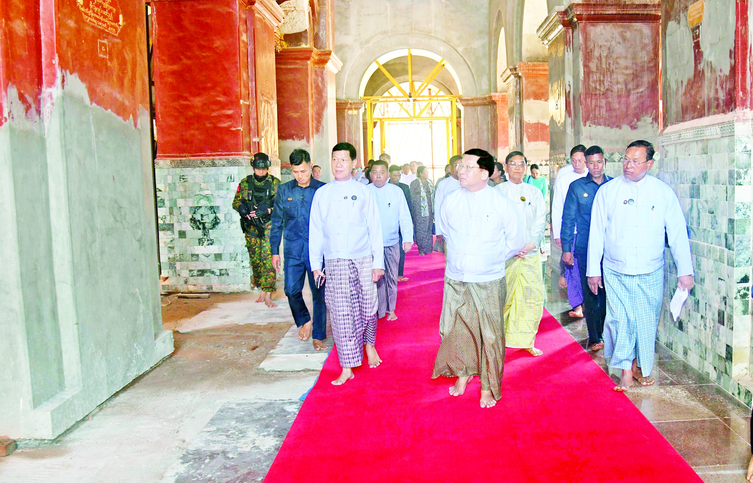 ပြည်ထောင်စုသမ္မတ မြန်မာနိုင်ငံတော် ယာယီသမ္မတ နိုင်ငံတော်လုံခြုံရေးနှင့် အေးချမ်းသာယာရေး ကော်မရှင် ဥက္ကဋ္ဌ ဗိုလ်ချုပ်မှူးကြီး မင်းအောင်လှိုင်သည် ဇနီး ဒေါ်ကြူကြူလှ၊ ကော်မရှင်အတွင်းရေးမှူး တွဲဖက်အမှုဆောင်ချုပ် ဗိုလ်ချုပ် ကြီး ရဲဝင်းဦးနှင့်ဇနီး၊ ခရီးစဉ်တွင်လိုက်ပါ လာသည့် အဖွဲ့ဝင်များ၊ မန္တလေးတိုင်းဒေသ ကြီးဝန်ကြီးချုပ်၊ ကာကွယ်ရေးဦးစီးချုပ် ရုံးမှ အဆင့်မြင့်တပ်မတော်အရာရှိကြီး များ၊ အလယ်ပိုင်းတိုင်းစစ်ဌာနချုပ် တိုင်းမှူးနှင့် အဖွဲ့ဝင်များလိုက်ပါ၍ယနေ့နံနက်ပိုင်းတွင် မန္တလေးမြို့ မဟာမုနိဘုရားကြီးသို့ သွားရောက်ဖူးမြော် ကြည်ညိုပြီး ငလျင်ဒဏ်ကြောင့် ထိခိုက်ပျက်စီးခဲ့ရသည့် သာသနိကအဆောက်အအုံများအား ရှေးမူမပျက် ပြန်လည်တည်ဆောက် ပြုပြင်မွမ်းမံနေမှု အခြေအနေများကို ကြည့်ရှုစစ်ဆေးသည်။
