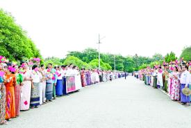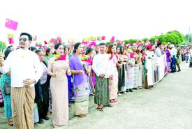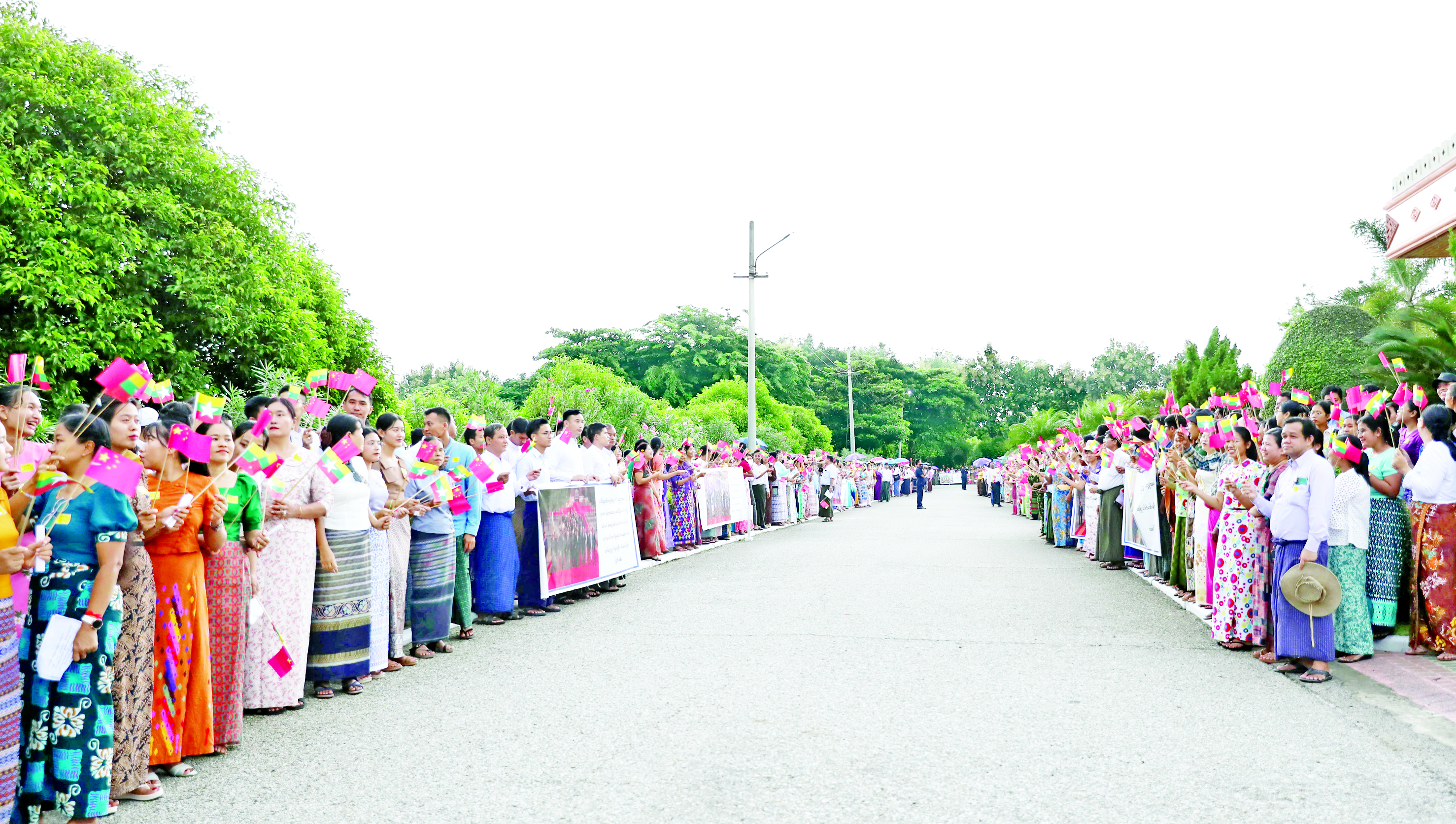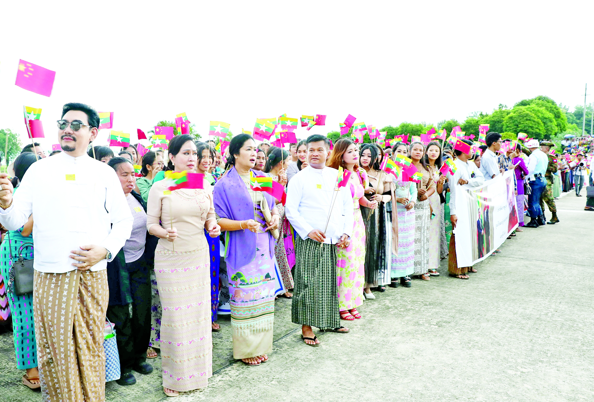 ထို့ပြင် “တရုတ်-မြန်မာ ချစ်ကြည်ရေး အဓွန့်ရှည်ပါစေ”၊ “အမျိုး၊ ဘာသာ၊ သာသနာအတွက် ကြိုးပမ်းဆောင်ရွက်နေသည့် ဗိုလ်ချုပ်မှူးကြီး မင်းအောင်လှိုင် ကျန်းမာပါစေ”၊ “ ယာယီသမ္မတ နိုင်ငံတော်လုံခြုံရေးနှင့် အေးချမ်းသာယာရေး ကော်မရှင်ဥက္ကဋ္ဌ ဗိုလ်ချုပ်မှူးကြီးမင်းအောင်လှိုင် ကျန်းမာပါစေ”၊ “တရုတ်-မြန်မာ ချစ်ကြည်ရေးခိုင်မြဲပါစေ”၊ “တရုတ်-မြန်မာ ချစ်ကြည်ရေး အဓွန့်ရှည်ပါစေ” စသည့် ကြွေးကြော်သံများကို ကြွေးကြော်၍လည်းကောင်း၊ “မြန်မာ-တရုတ် နှစ်နိုင်ငံ အကြား ဘက်စုံမဟာဗျူဟာမြောက် ပူးပေါင်းဆောင်ရွက်ရေး ကဏ္ဍအလိုက် အောင်မြင်ပါစေ”၊ “နိုင်ငံ့အရေးအတွက် ဆောင်ရွက်ခဲ့သော ဗိုလ်ချုပ်မှူးကြီး မင်းအောင်လှိုင်အား လှိုက်လှဲစွာကြိုဆိုပါ၏”၊ “မြန်မာ-တရုတ် အေးအတူပူအမျှဖြင့် ဆွေမျိုးပေါက်ဖော်ချစ်ကြည်မှု အောင်မြင်ပါစေ” စသည့်ဆိုင်းဘုတ်များကိုင်ဆောင်၍လည်းကောင်း တရုတ်-မြန်မာ နှစ်နိုင်ငံ အလံငယ်များ ဝှေ့ယမ်း၍လည်းကောင်း သောင်းသောင်းဖြဖြ ကြိုဆို ဂုဏ်ပြုနှုတ်ဆက်ခဲ့ကြသည်။