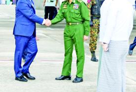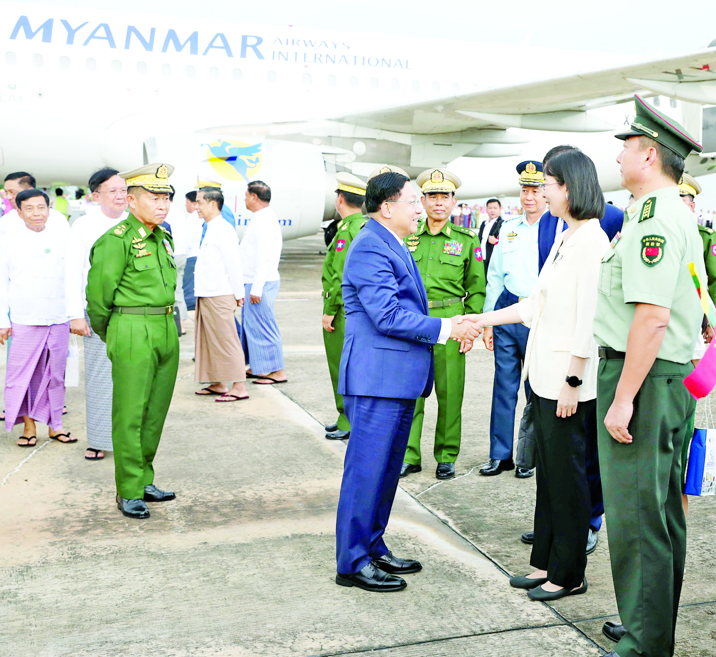 တရုတ်ပြည်သူ့ သမ္မတနိုင်ငံ သမ္မတ H.E. Mr. Xi Jinping ၏ ဖိတ်ကြားမှုအရ တရုတ်နိုင်ငံတွင် ကျင်းပပြုလုပ်ခဲ့သည့် ရှန်ဟိုင်းပူးပေါင်းဆောင်ရွက်မှုအဖွဲ့ ထိပ်သီးအစည်းအဝေး (Shanghai Cooperation Organisation – SCO SUMMIT 2025 Plus)နှင့် တရုတ်ပြည်သူများ၏ ဂျပန် ခုခံတော်လှန်ရေး စစ်ပွဲနှင့် ကမ္ဘာ့ဖက်ဆစ်ဆန့်ကျင်ရေးစစ်ပွဲ အောင်နိုင်ခြင်း နှစ်(၈၀)ပြည့် အထိမ်းအမှတ်စစ်ရေးပြအခမ်းအနားများသို့ တက်ရောက်ခဲ့သည့် ပြည်ထောင်စုသမ္မတ မြန်မာနိုင်ငံတော် ယာယီသမ္မတ နိုင်ငံတော်လုံခြုံရေးနှင့် အေးချမ်းသာယာရေးကော်မရှင် ဥက္ကဋ္ဌ ဗိုလ်ချုပ်မှူးကြီး မင်းအောင်လှိုင် ဦးဆောင်သော မြန်မာအဆင့်မြင့် ကိုယ်စားလှယ်အဖွဲ့ဝင်များသည် ယနေ့မွန်းလွဲပိုင်းတွင် တရုတ်ပြည်သူ့သမ္မတနိုင်ငံ စီချွမ်ပြည်နယ် ချန်ဒူးမြို့ရှိ Chengdu Shuangliu အပြည်ပြည်ဆိုင်ရာလေဆိပ်မှ အပြည်ပြည်ဆိုင်ရာ မြန်မာလေကြောင်း (MAI) အထူးလေယာဉ်ဖြင့် နေပြည်တော်သို့ ထွက်ခွာရာ မြန်မာနိုင်ငံဆိုင်ရာ တရုတ်ပြည်သူ့သမ္မတနိုင်ငံ သံအမတ်ကြီး H.E. Ms. Ma Jia ၊ တရုတ်နိုင်ငံဆိုင်ရာ မြန်မာနိုင်ငံသံအမတ်ကြီး ဦးတင်မောင်ဆွေ၊ မြန်မာစစ်သံ (ကြည်း၊ ရေ၊ လေ) ဗိုလ်မှူးချုပ်ဇော်ဇော်နိုင်၊ စီချွမ်ပြည်နယ် ဒုတိယအုပ်ချုပ်ရေးမှူး၊ ချုံချင့်မြို့မှ မြန်မာကောင်စစ်ဝန်ချုပ်ရုံး၊ ကောင်စစ်ဝန်ချုပ် ဦးကျော်ဇေယျာလင်းနှင့် တာဝန်ရှိ သူများက လေဆိပ်၌ ပို့ဆောင် နှုတ်ဆက်ကြသည်။
