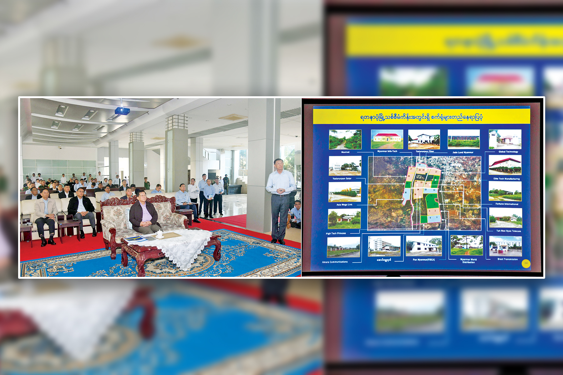 ဦးစွာ နိုင်ငံတော်ယာယီသမ္မတ နိုင်ငံတော်လုံခြုံရေးနှင့် အေးချမ်းသာယာရေး ကော်မရှင်ဥက္ကဋ္ဌနှင့် အဖွဲ့ဝင်များသည် ရတနာပုံမြို့သစ် စီမံကိန်းရှိ ရတနာပုံတယ်လီပို့ အဆောက်အအုံသို့ ရောက်ရှိရာ ဆောက်လုပ်ရေးဝန်ကြီးဌာန ပြည်ထောင်စုဝန်ကြီး ဦးမျိုးသန့်က ရတနာပုံမြို့သစ် စီမံကိန်းဆိုင်ရာ အချက်အလက်များ၊ စီမံကိန်းအတွင်းဆောင်ရွက်ထားရှိမှု၊ လူနေအိမ်ရာများ အကောင်အထည်ဖော် ဆောင်ရွက်ထားရှိမှု၊ ရတနာပုံ တယ်လီပို့ဆိုင်ရာ အဆောက်အအုံများ အကောင်အထည်ဖော် ဆောင်ရွက်ထားရှိမှု၊ စီမံကိန်းနယ်မြေအတွင်း လမ်းဖောက်လုပ်ခြင်း၊ ရေရရှိရေး၊ လျှပ်စစ်မီးရရှိရေးနှင့် အခြေခံအဆောက်အအုံများ ဆောင်ရွက်ထားရှိမှု၊ စီမံကိန်းဆောင်ရွက်ရန် Expression Of Interest – EOI ဖိတ်ခေါ်ဆောင်ရွက်ထားရှိမှု၊ နည်းပညာစက်မှုဇုန် အကောင်အထည်ဖော် ဆောင်ရွက်ထားရှိမှု အခြေအနေများ၊ လုပ်ငန်းများ လည်ပတ်လျက်ရှိမှုနှင့် စီမံကိန်းဆက်လက် ဆောင်ရွက်နိုင်မည့် အခြေအနေများကိုလည်းကောင်း၊ ပို့ဆောင်ရေးနှင့် ဆက်သွယ်ရေးဝန်ကြီးဌာန ပြည်ထောင်စုဝန်ကြီး ဦးမြထွန်းဦးက ရတနာပုံမြို့သစ်စီမံကိန်းဆိုင်ရာအချက်အလက်များ၊ စီမံကိန်းအဆင့်အလိုက် အကောင်အထည်ဖော်ဆောင်ရွက်လျက်ရှိမှု၊ မြန်မာ့ဆက်သွယ်ရေးလုပ်ငန်းပိုင် အုပ်ချုပ်မှုဆိုင်ရာ အဆောက်အအုံများ၊ ဝန်ထမ်းအိမ်ရာများဆိုင်ရာ အချက်အလက်များ၊ ရတနာပုံတယ်လီပို့ကုမ္ပဏီ လီမိတက်ပိုင် အဆောက်အအုံများဆိုင်ရာ အချက်အလက်များ၊ Soft Base Factories Area ရှိ စက်ရုံများဆိုင်ရာ အချက်အလက်များနှင့်ပတ်သက်၍လည်းကောင်း ရှင်းလင်းတင်ပြကြသည်။